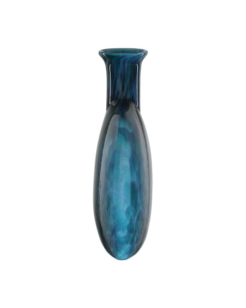 The Pavonini Vase is a mold-made glass vase shaped like an oversized perfume bottle that dazzles in a brilliant shade of blue. The surface seems alive with dynamic movement achieved when deep blue and bright teal glass are expertly fused and marbled. The bold silhouette gives the vase a luxurious appeal. The decorative piece is shallow so it can sit close to the wall to take up less surface space on a console or nightstand.