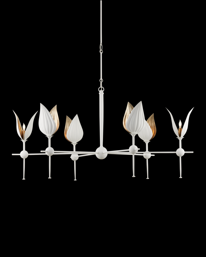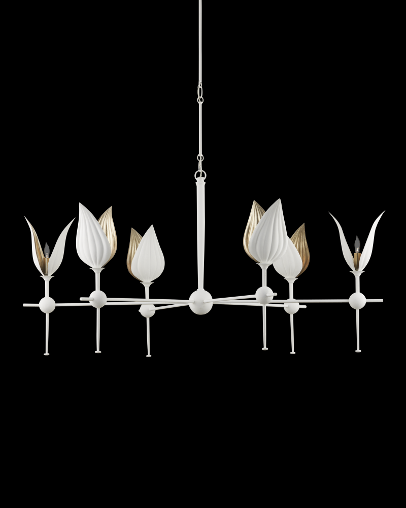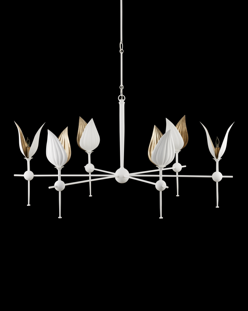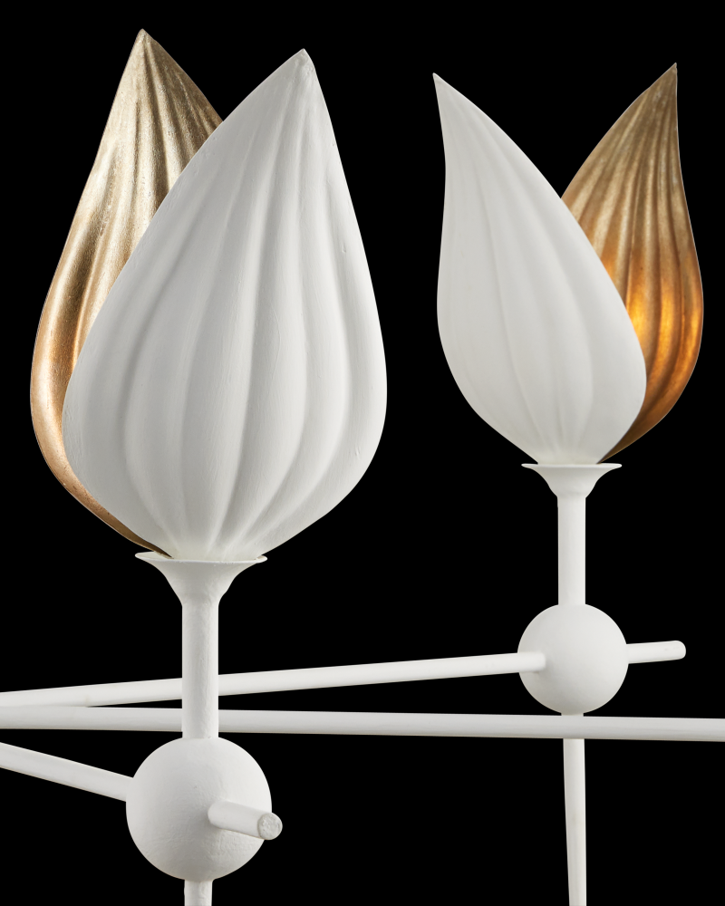 Made of wrought iron in a gesso white finish on the exterior and a silver leaf finish on the interior of its shades, the Peace Lily Chandelier is one of our designs that proves how a brute material can be made to appear delicate. The white chandelier with its floral motif is a versatile design, featuring a gesso finish with silver leaf accents to fit into the genre of 1920s Paris styling. Adjustable from 28" to 72.25" with use of included chain/rod kit/cable. If your space calls for a longer drop, additional chain/rods/cable is available for purchase.