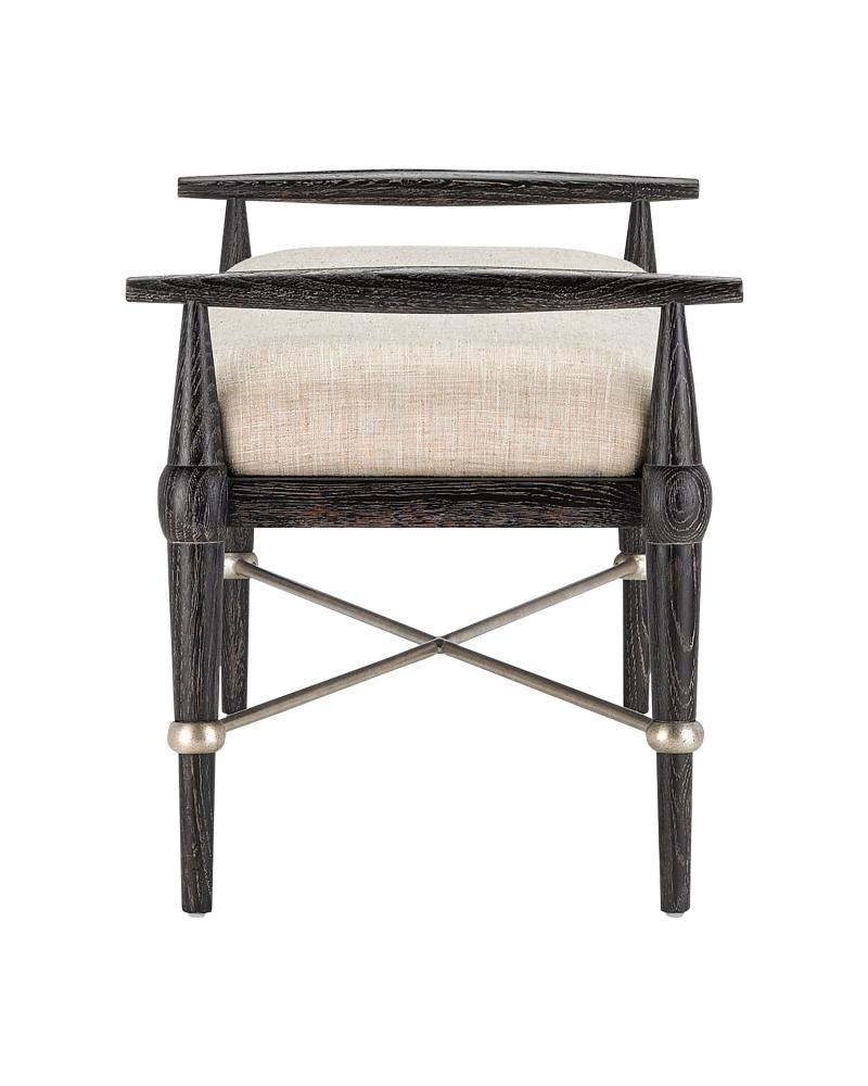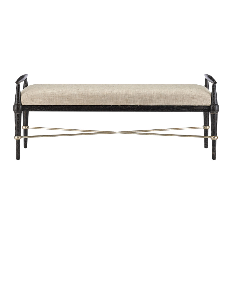 The Perrin Black Bench is a take on mid-century modern but with a slight transitional twist. Made of oak in an ebonized taupe finish, the dark brown bench is ornamented with iron stretchers in a silver Granello finish. It is upholstered in Finn Natural fabric, which is made of 100 percent polyester.