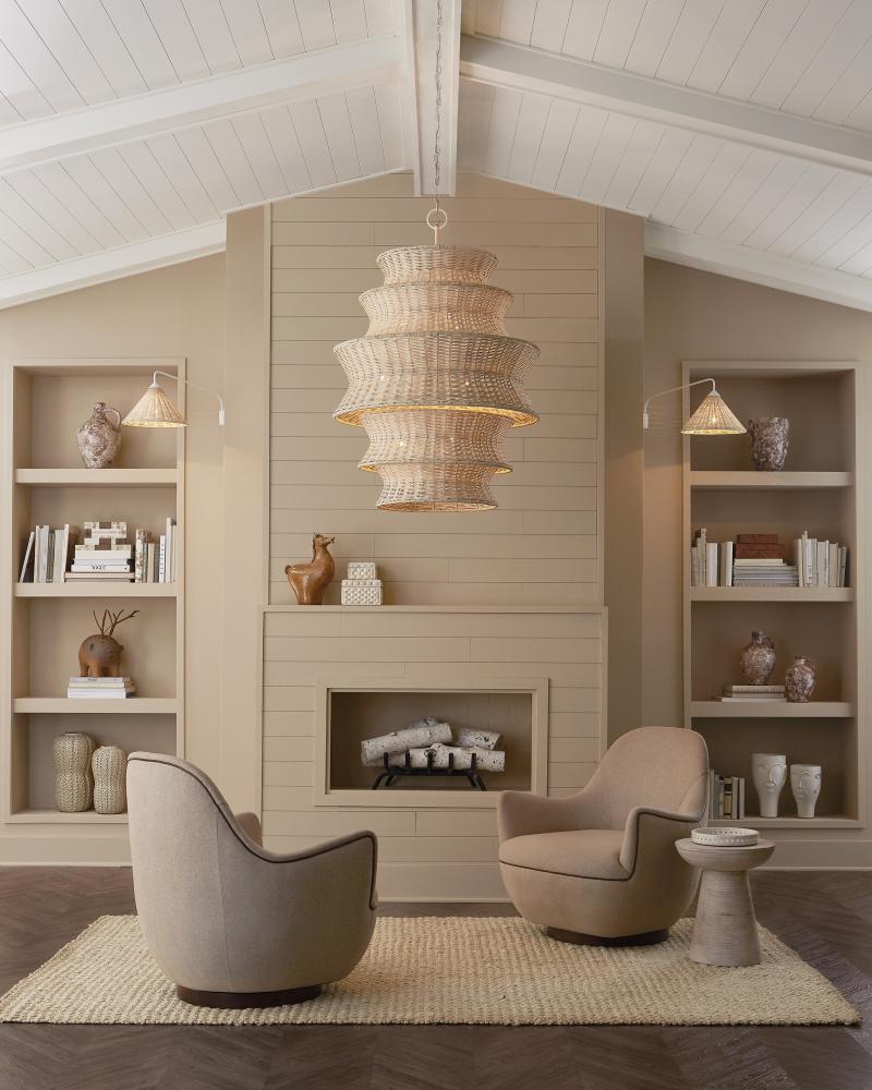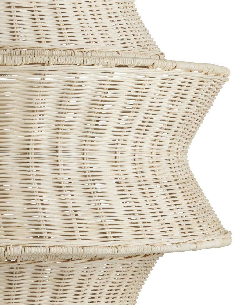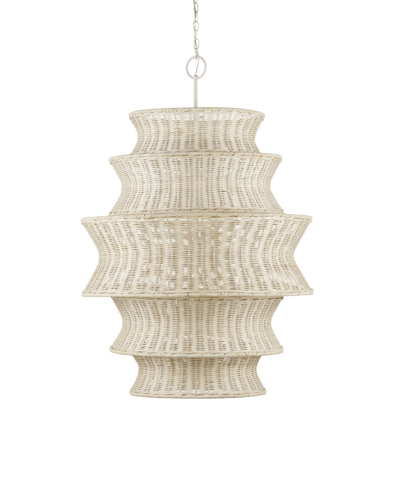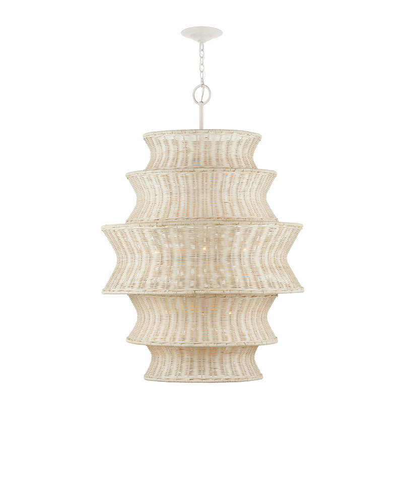 The Phebe Large Chandelier is a dynamic design that highlights the talents of our weavers and the skillful use of natural materials. This five-tier white chandelier achieves a cohesive look with circular wire frames wrapped in the same material, with the entire fixture bleached for a uniform finish. The vanilla finish of the hardware enhances the light and airy feel of the design. Inspired by a natural material story, the Phebe exudes effortless elegance. Adjustable from 51.5" to 119.5" with use of included chain/rod kit/cable. If your space calls for a longer drop, additional chain/rods/cable is available for purchase.