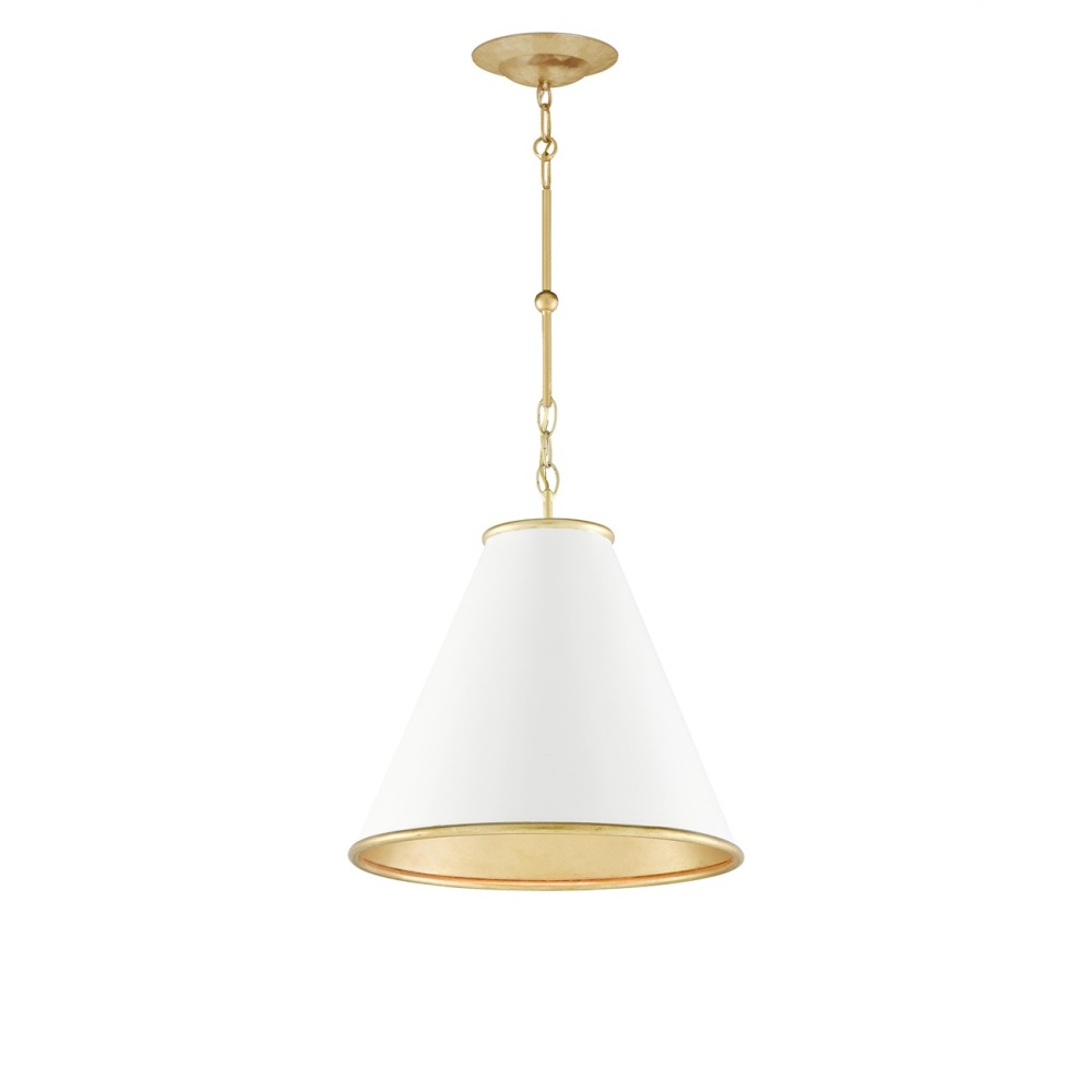 Our Pierrepont White Small Pendant is made of wrought iron with a gesso white finish on its exterior and a contemporary gold leaf finish on the interiors of the shades. The rings connecting them gleam in a painted gold finish. There are a number of other sizes and finishes in the Pierrepont family of fixtures. Adjustable from 22" to 100" with use of included chain/rod kit/cable. If your space calls for a longer drop, additional chain/rods/cable is available for purchase.