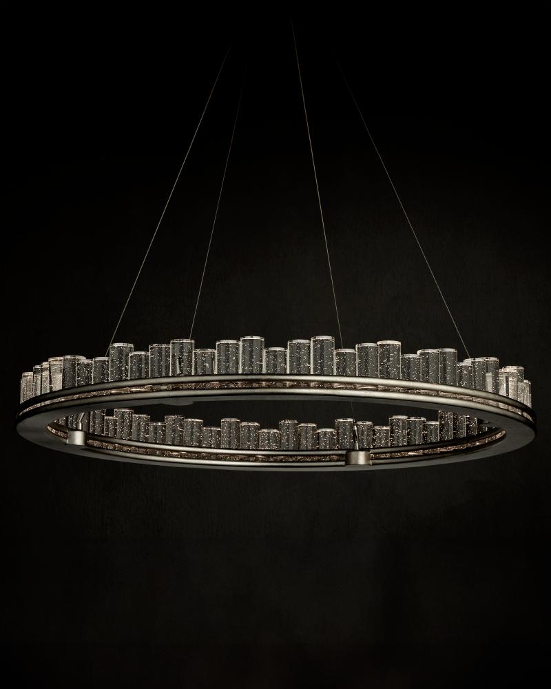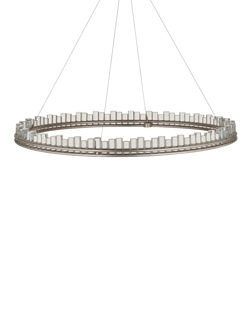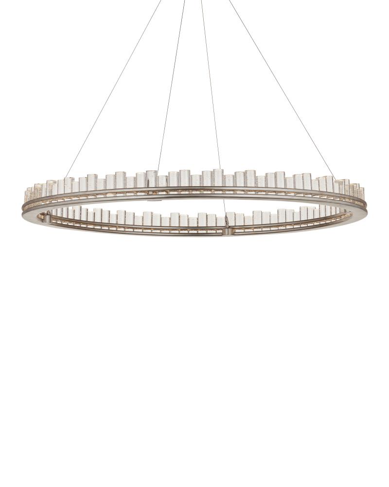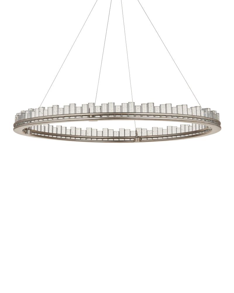 When envisioning the Pleiades Large Chandelier, the goal was to create drama with cylindrical pieces of seeded crystal fitted into a generously scaled silver leaf wrought iron ring. The open design of the ring is essential to enhance the sensational illumination, as it is fitted with an integrated LED strip. The light effervesces when it strikes the bubbles in the crystal rods, adding to the chandelier's allure. The Pleiades is dimmable. Adjustable from 32" to 148" with use of included chain/rod kit/cable. If your space calls for a longer drop, additional chain/rods/cable is available for purchase.