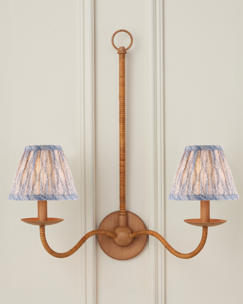 A fan-like pattern in a soft blue dresses this tapered chandelier shade from design partner Lacefield Designs.