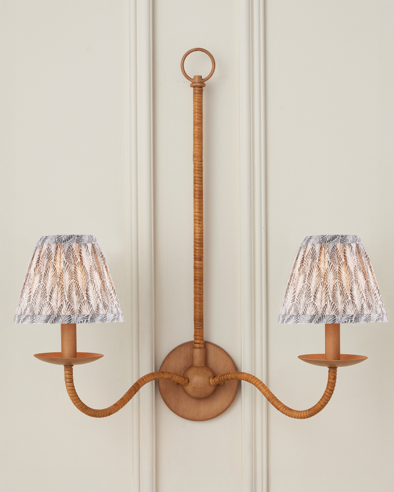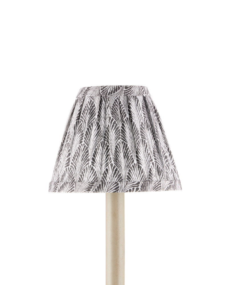 A fan-like gray pattern dresses this tapered chandelier shade from design partner Lacefield Designs.