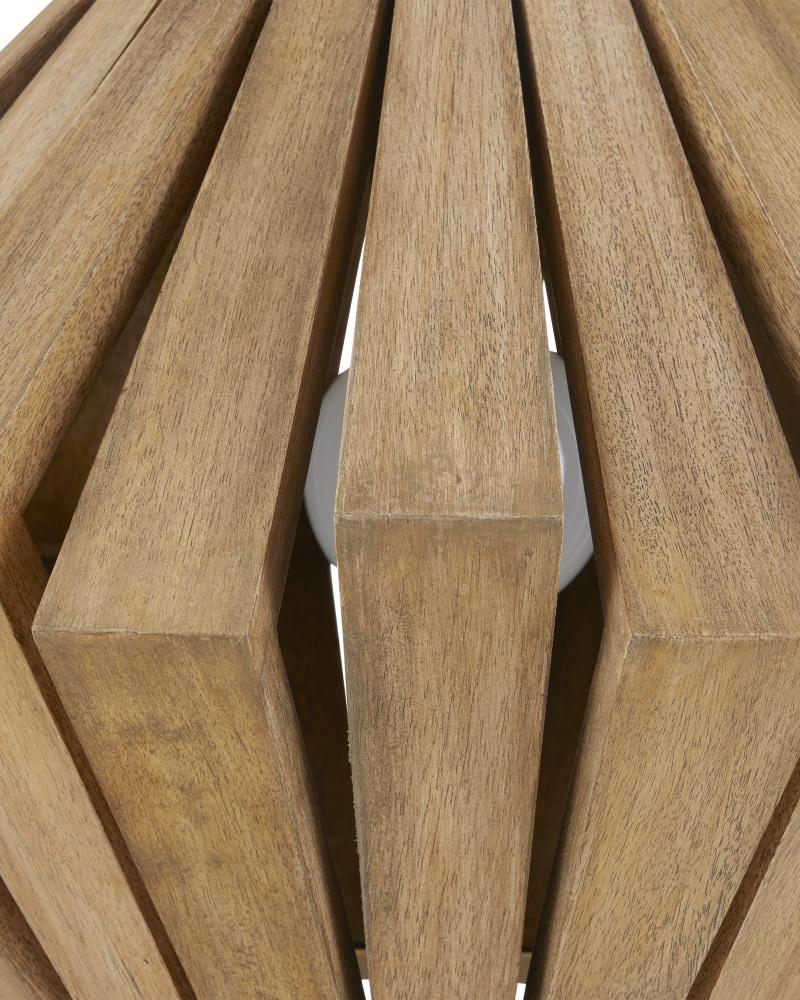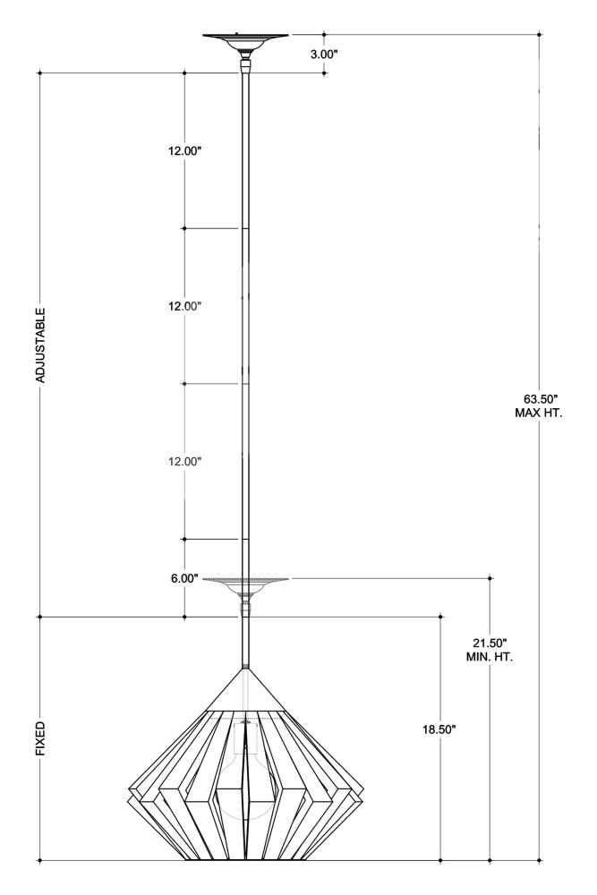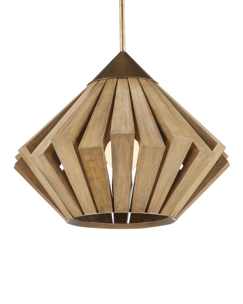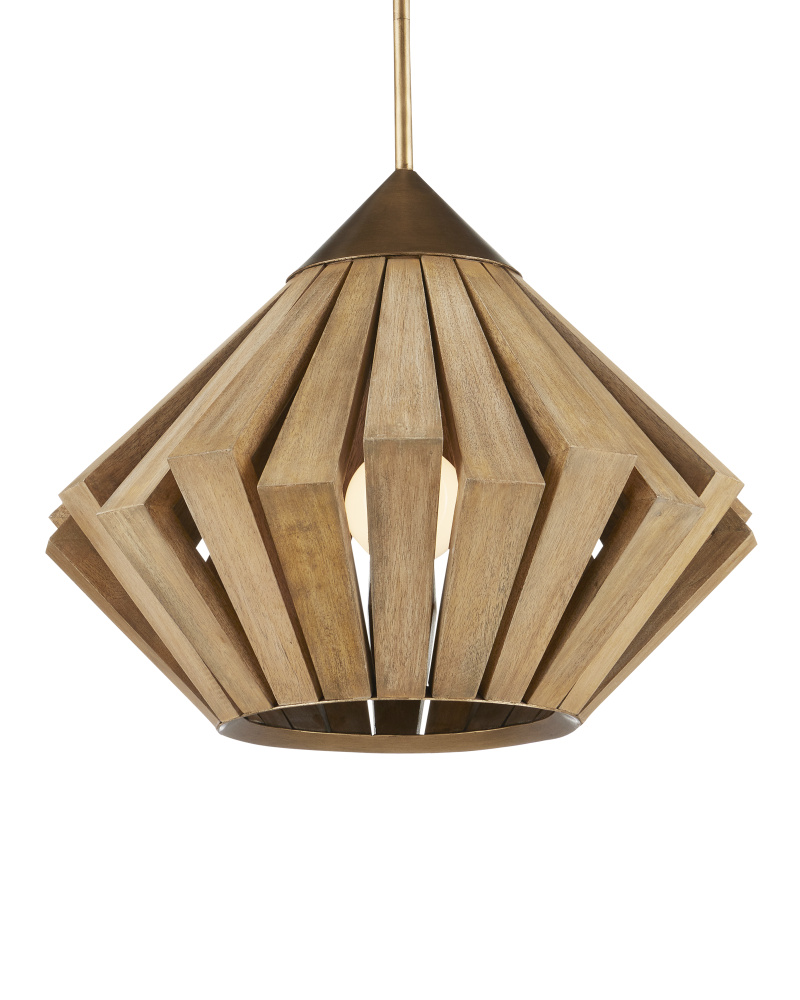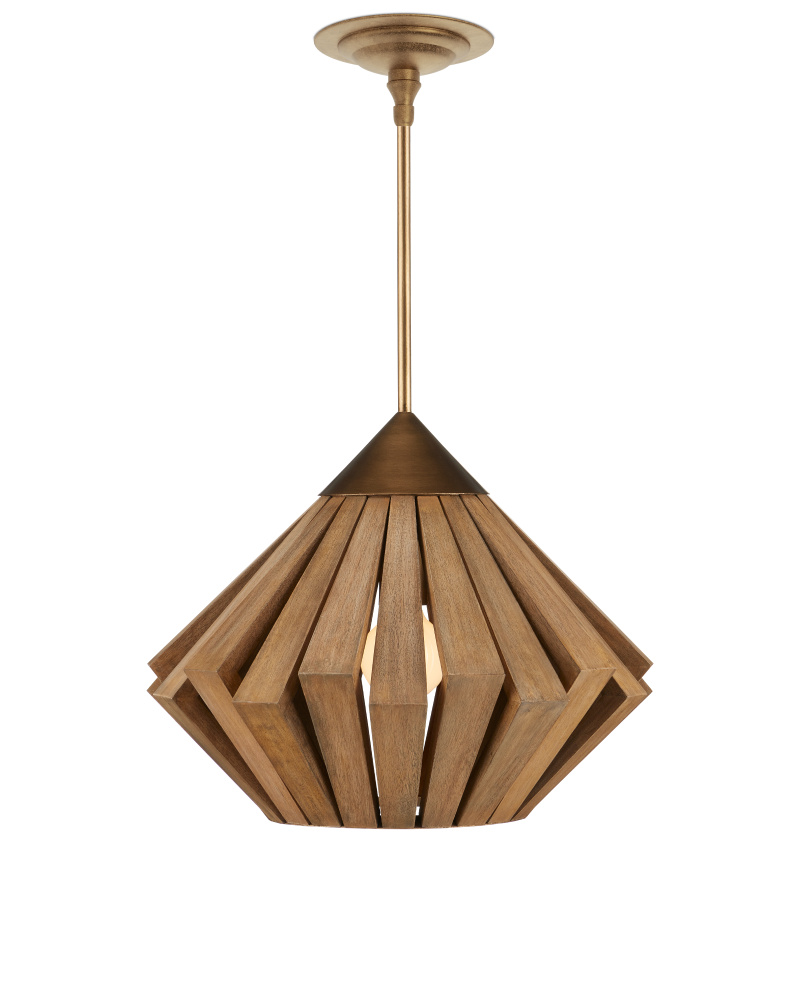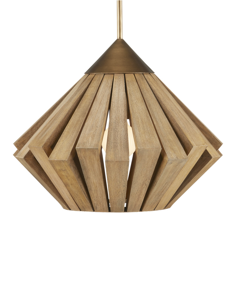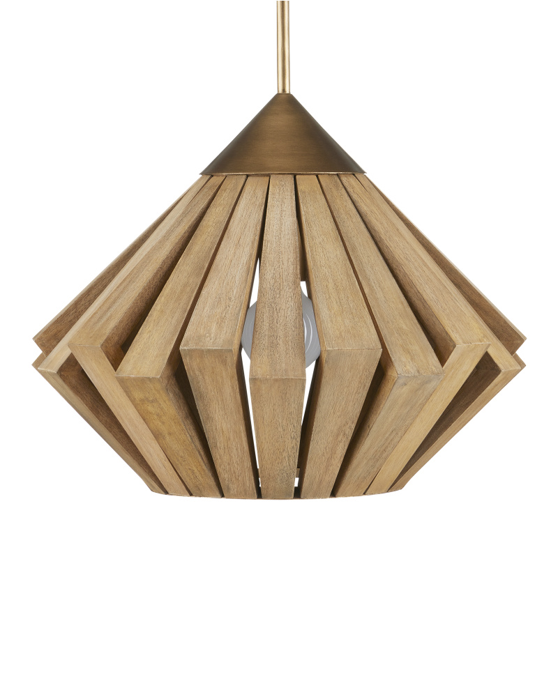 The thick wood slats that make up the shade of the Plunge Pendant brings the brown pendant a mid-century modern vibe with a hint of brutalist style. Fastened to a downturned metal cup in a brass finish, the slanting wood is finished in toffee, the combination creating great warmth. The varying placement of the angled wood pieces is a design detail of note, as is the fact that this fixture can be hung close to the ceiling. Adjustable from 21.5" to 63.5" with use of included chain/rod kit/cable. If your space calls for a longer drop, additional chain/rods/cable is available for purchase.