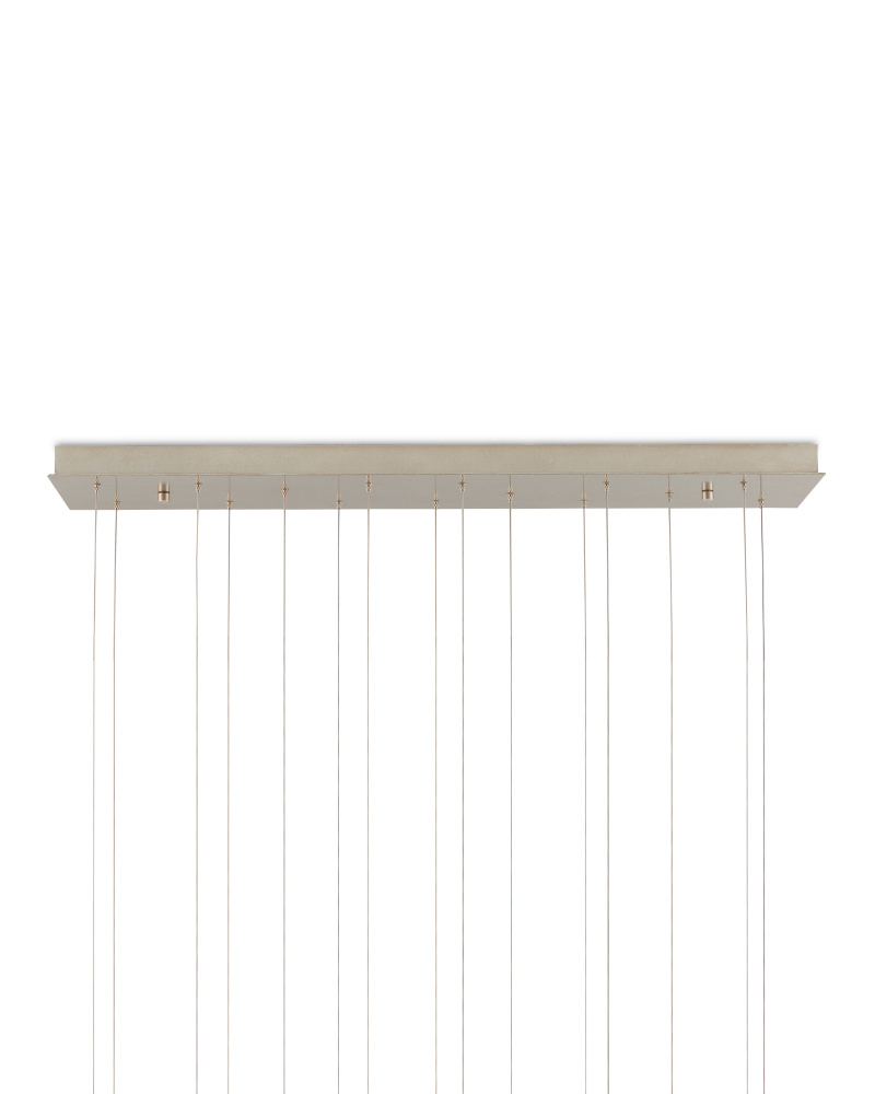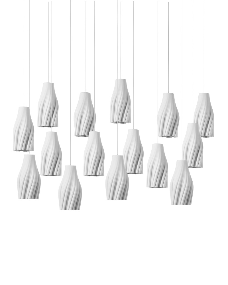 The Posh 15-Light Linear Multi-Drop Pendant has shades made of white ceramic crafted to resemble tassels. The sense of movement created by the material is an artisanal touch that brings the shades a lovely graceful quality. The thin silver cables from which they hangs leave the shades themselves to be the star of the design.