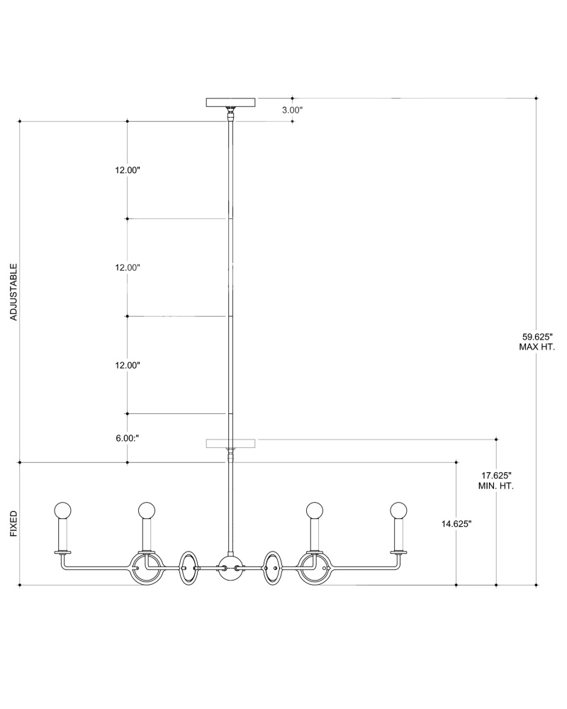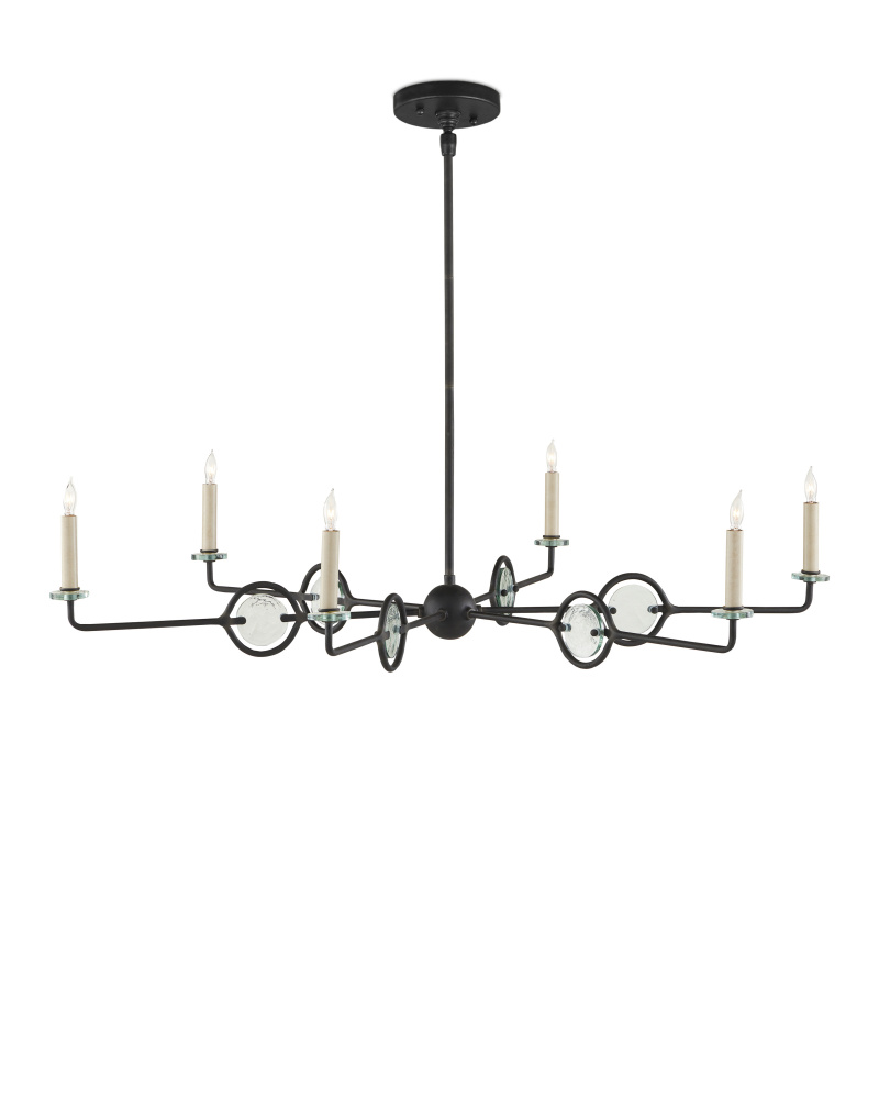 The Privateer Chandelier is one of our designs that mixes black with recycled glass in a sophisticated way. The long thin rod that culminates at a cog holding the arms, and the arms and circlets holding the glass pieces are in a blacksmith finish. The bobeches are also glass, and the candle sleeves are in a smokewood finish. Adjustable from 17.625" to 59.625" with use of included chain/rod kit/cable. If your space calls for a longer drop, additional chain/rods/cable is available for purchase.