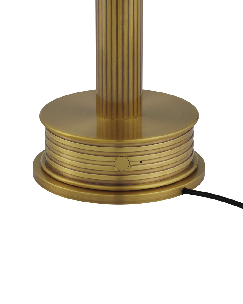 The Promenade Brass Cordless Table Lamp will wander with you wherever you need an ambient light source. At just 10 inches high, the gold lamp glows in a polished brass finish with a glossy white glass cap. The on and off button is on the side of the base, as is the battery-life indication light that alerts when it is time to recharge. This little lamp is a stylish choice when the ultimate freedom of a cordless lamp is desired.