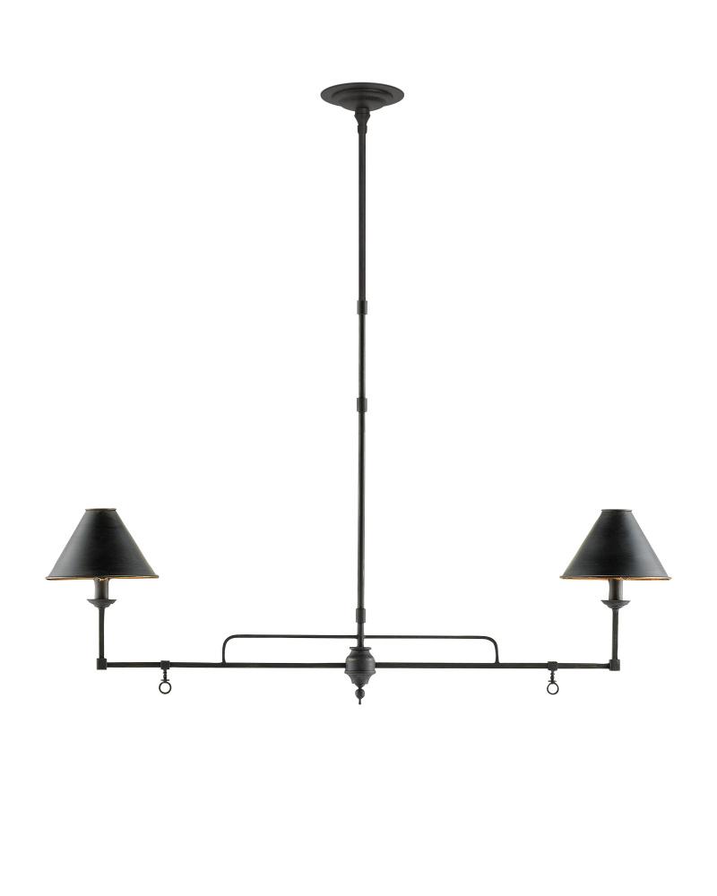 A modern take on the traditional gas light, the Prosperity Rectangular Chandelier has a block-accented frame in a French black finish. The contemporary gold leaf finish on the interiors of the two shades brings an opulence to the illumination. Adjustable from 24.5" to 60.5" with use of included chain/rod kit/cable. If your space calls for a longer drop, additional chain/rods/cable is available for purchase.
