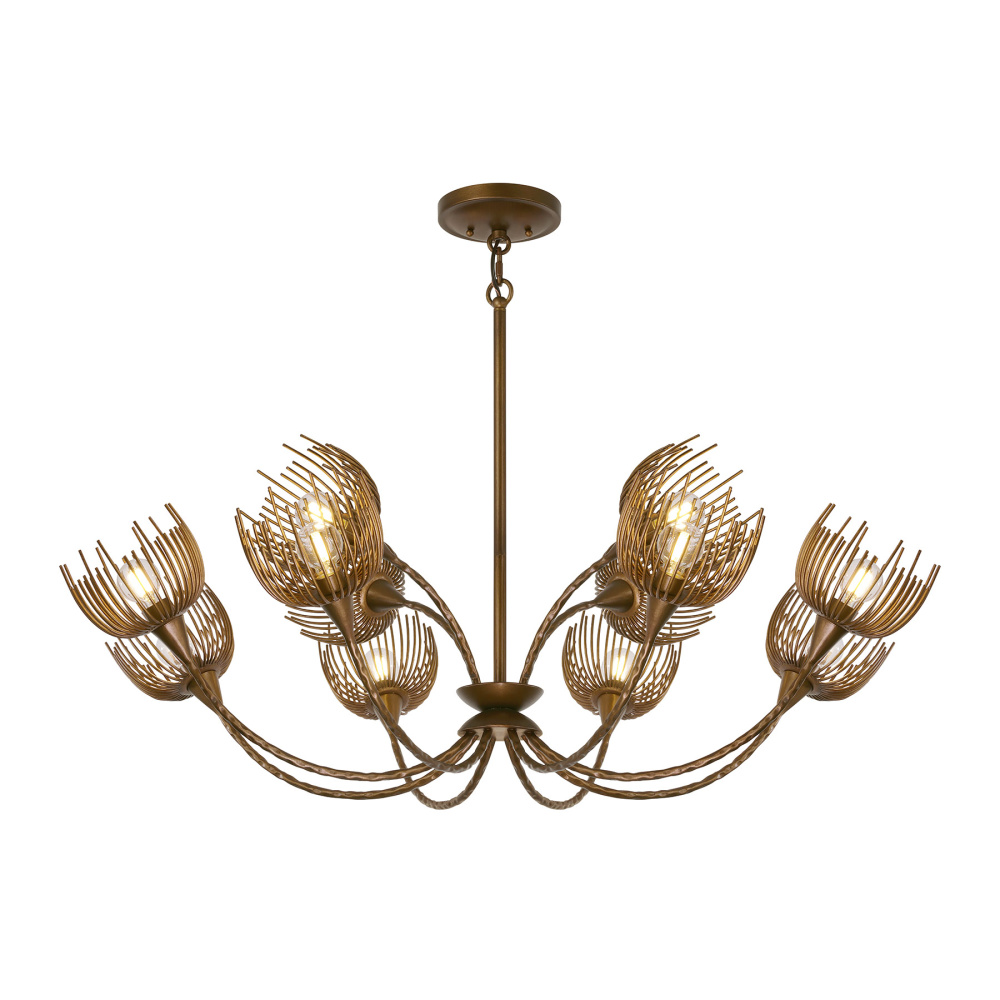 The Savoy House Protea 12-light pendant was designed by award-winning interior designer and TV host Breegan Jane. It is named for a beautiful African flowering plant that is also known as the sugarbush. The sugarbush has a distinctive shape that is portrayed here with gently curving hammered arms topped by delicate blossoms, all finished in a rich bronze Manchester finish hand-painted by artisans. Protea is 40" in width and has an adjustable height ranging from 15.5" to 69.5". It uses twelve candelabra size bulbs of up to 60 watts per bulb. Bulbs not included. Comes with four 12" downrods and one 6" downrod.