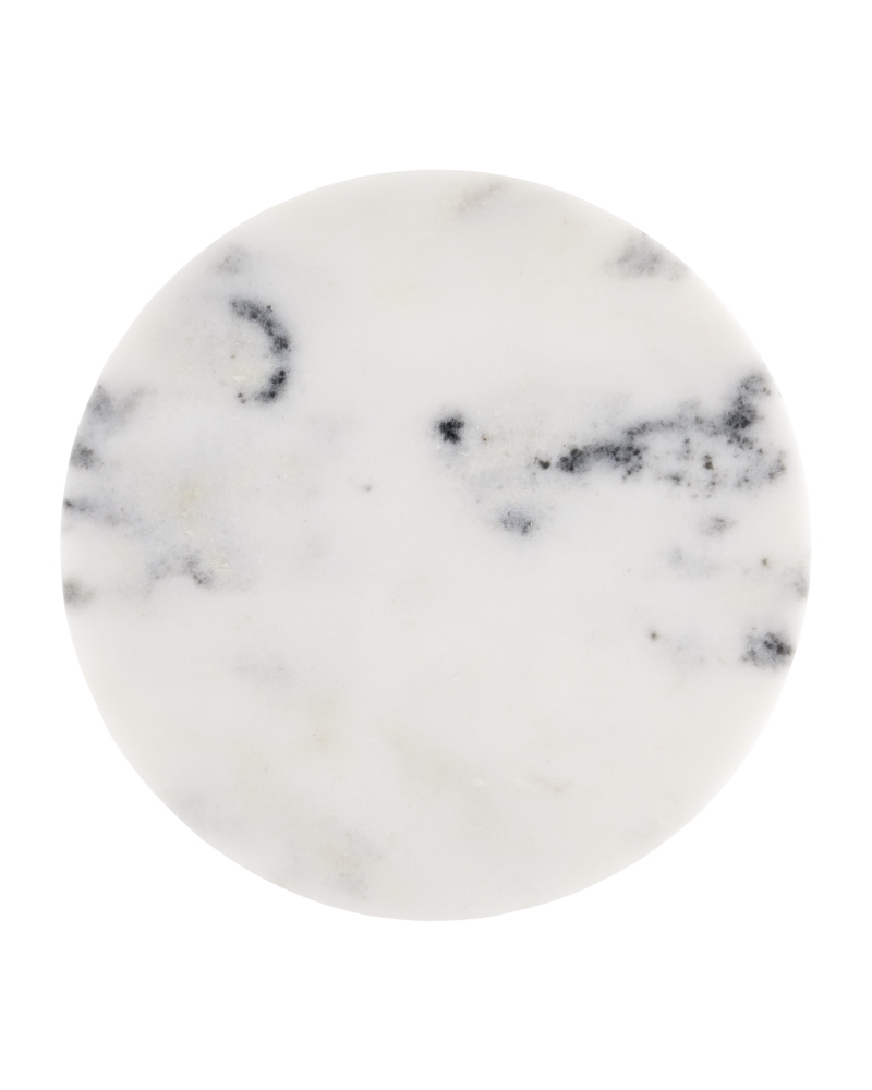 Created in three sections, the Quince White Marble Accent Table is turned like a wood table would be to reveal the personality of the natural stone. The petite white marble accent table has spots and veining in dark and light gray that flow in mysterious patterns along its surface. These attributes of the natural material will vary significantly from table to table. The personable small accent table reads like a sophisticated chess piece that exudes checkmate style.