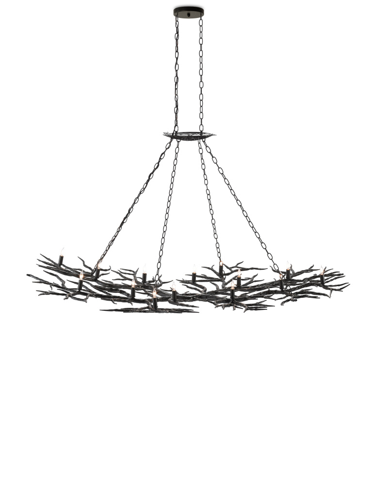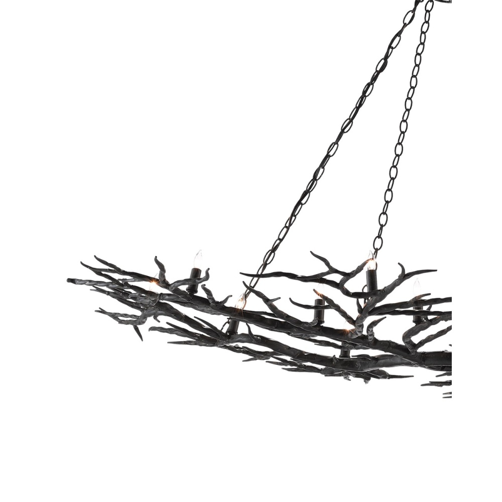 Our Rainforest Bronze Chandelier has fourteen lights nestled within the hand-forged wrought iron shade of this fixture. The limbs, in a rustic bronze finish, are life-like as they cup the bulbs placed so skillfully on them. Adjustable from 52" to 76" with use of included chain/rod kit/cable. If your space calls for a longer drop, additional chain/rods/cable is available for purchase.