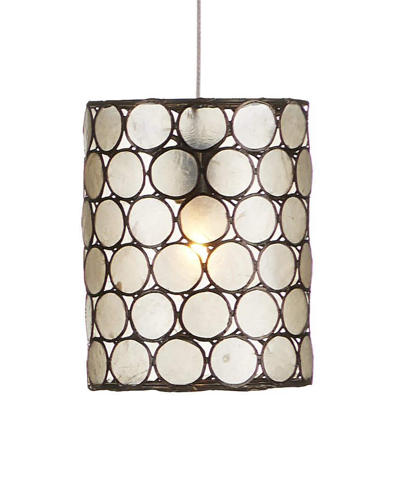 Natural Capiz shell and wrought iron in a Cupertino finish create a luminous circular pattern on the shade of the Regatta 1-Light Multi-Drop Pendant. The cylindrical pendant has such a pleasing glow when light shines through the lustrous shade. There is great artistry in achieving such a complex pattern, as each slice of shell has to be surrounded in metal and soldered into a frame once the metal circles are joined to each other. The canopy of this piece is luminous in a painted silver finish. This fixture is among Currey & Company's multi-drop pendant collection, which includes multiple configurations.