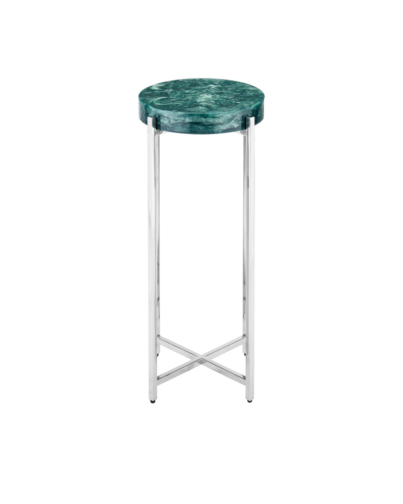 The Rina Teal Drinks Table has a top with a swirling surface created when pearlescent powder was mixed with composite to create the organic patterning. The round disc is inset into the metal frame like a gem. Four legs made of stainless steel in a polished nickel finish are connected by an ex-shaped stretcher. The silver and teal drinks table stands just over 23 inches tall and is 11 inches in diameter, which makes it ideal for rooms where space is limited.