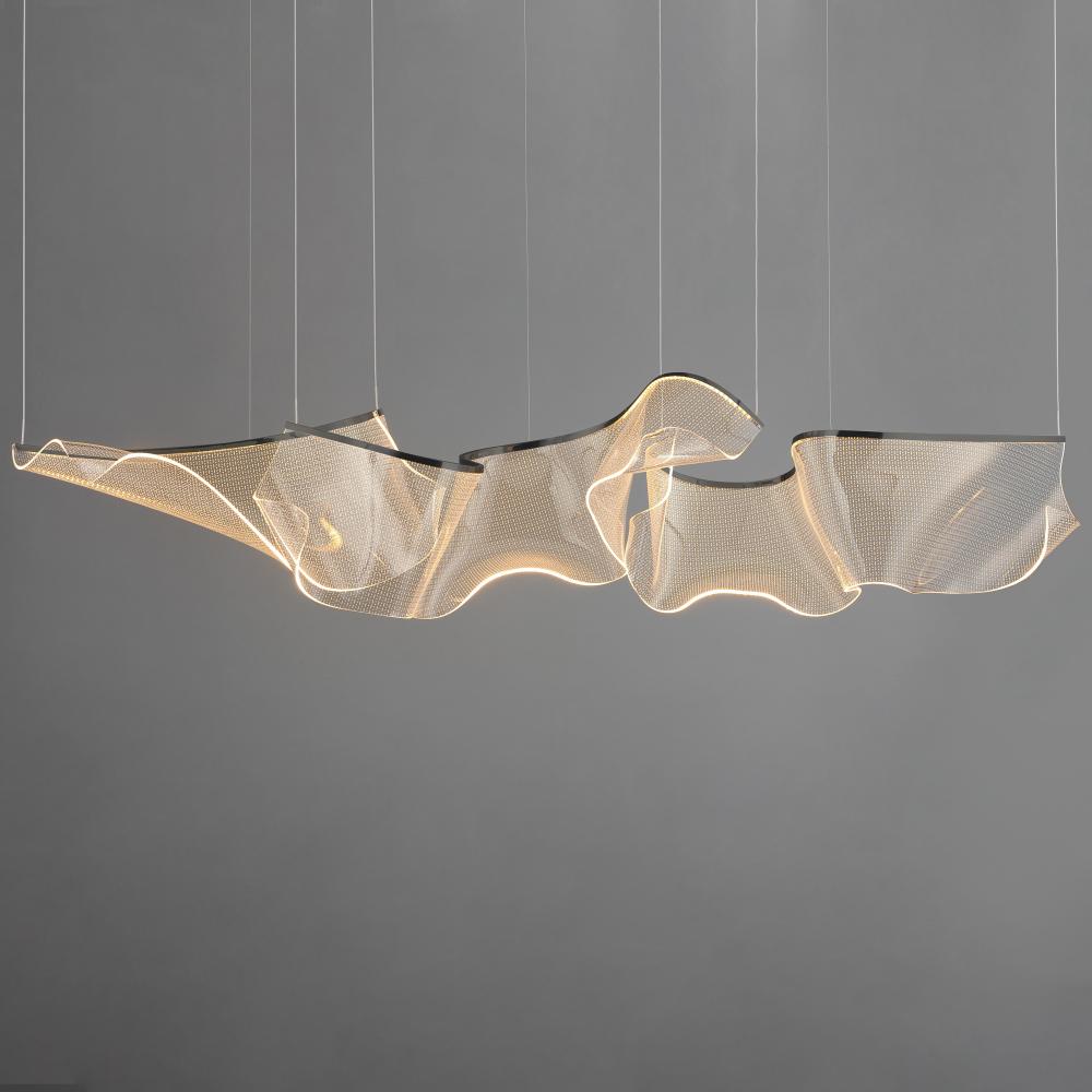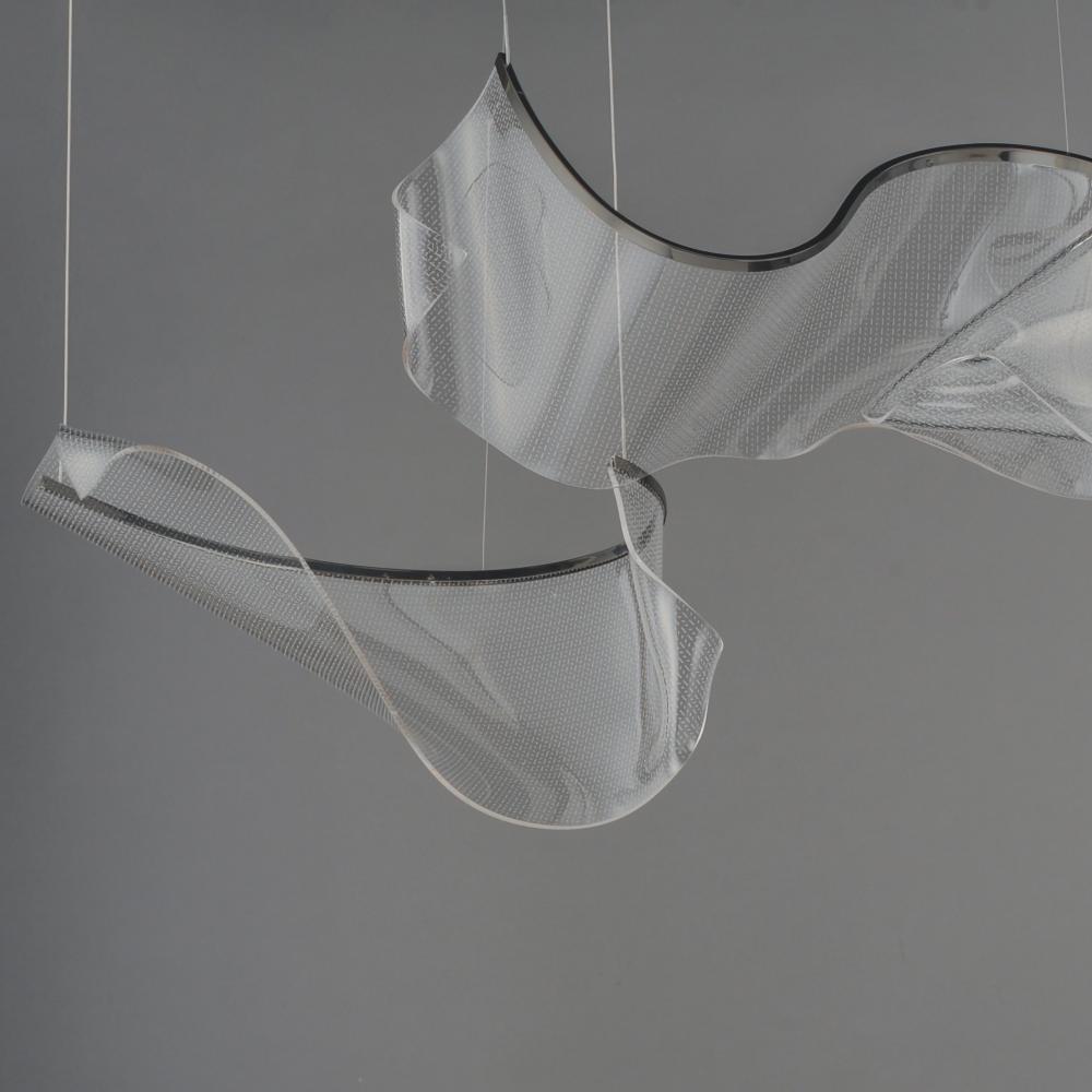 An airy arrangement of abstract forms, the Rinkle pendants feature sheets of transparent acrylic shaped by hand. The light guided acrylic captures the glow of energy efficient LEDs recessed within strips of shining stainless steel, obscuring the source of