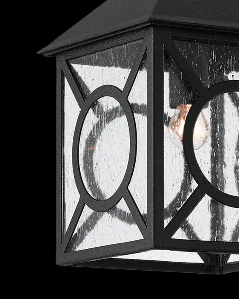 The Ripley Small Outdoor Lantern is one of twelve fixtures in our Twelfth Street collection of outdoor lighting that features a Trilux finish, the next generation of high-performance, weather-resistant finishing technology brought to the market exclusively by Currey & Company. The coating provides three levels of protection, and is fade resistant, crack resistant and rust resistant. We guarantee the finishes applied to our Twelfth Street pieces for five years. The metal on this sconce in the collection has been treated to our midnight finish that surrounds seeded-glass panes that turn the illumination to a soft glow behind the geometric detailing.