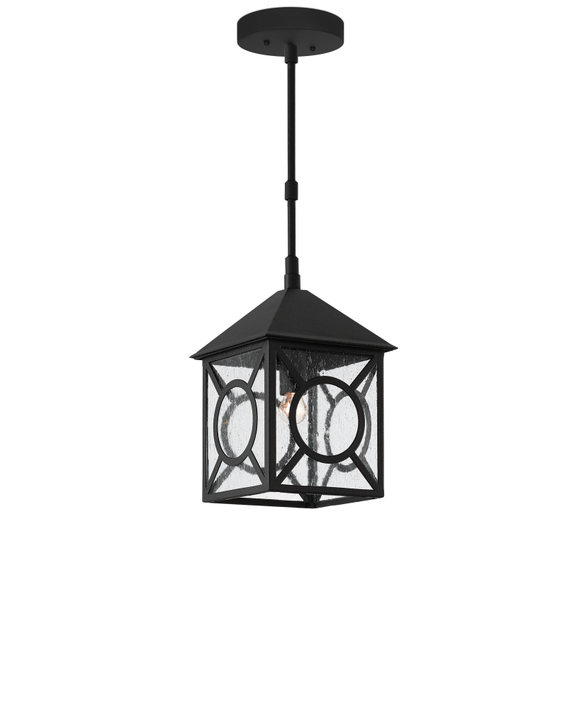 The Ripley Small Outdoor Lantern in our Twelfth Street collection of outdoor lighting features a high-performance, weather-resistant Trilux finish that is fade resistant, crack resistant and rust resistant. We guarantee the finishes applied to our Twelfth Street pieces for five years. The metal on this black sconce in a midnight finish surrounds seeded-glass panes. Adjustable from 22.50" to 59.50" with use of included chain/rod kit/cable. If your space calls for a longer drop, additional chain/rods/cable is available for purchase.