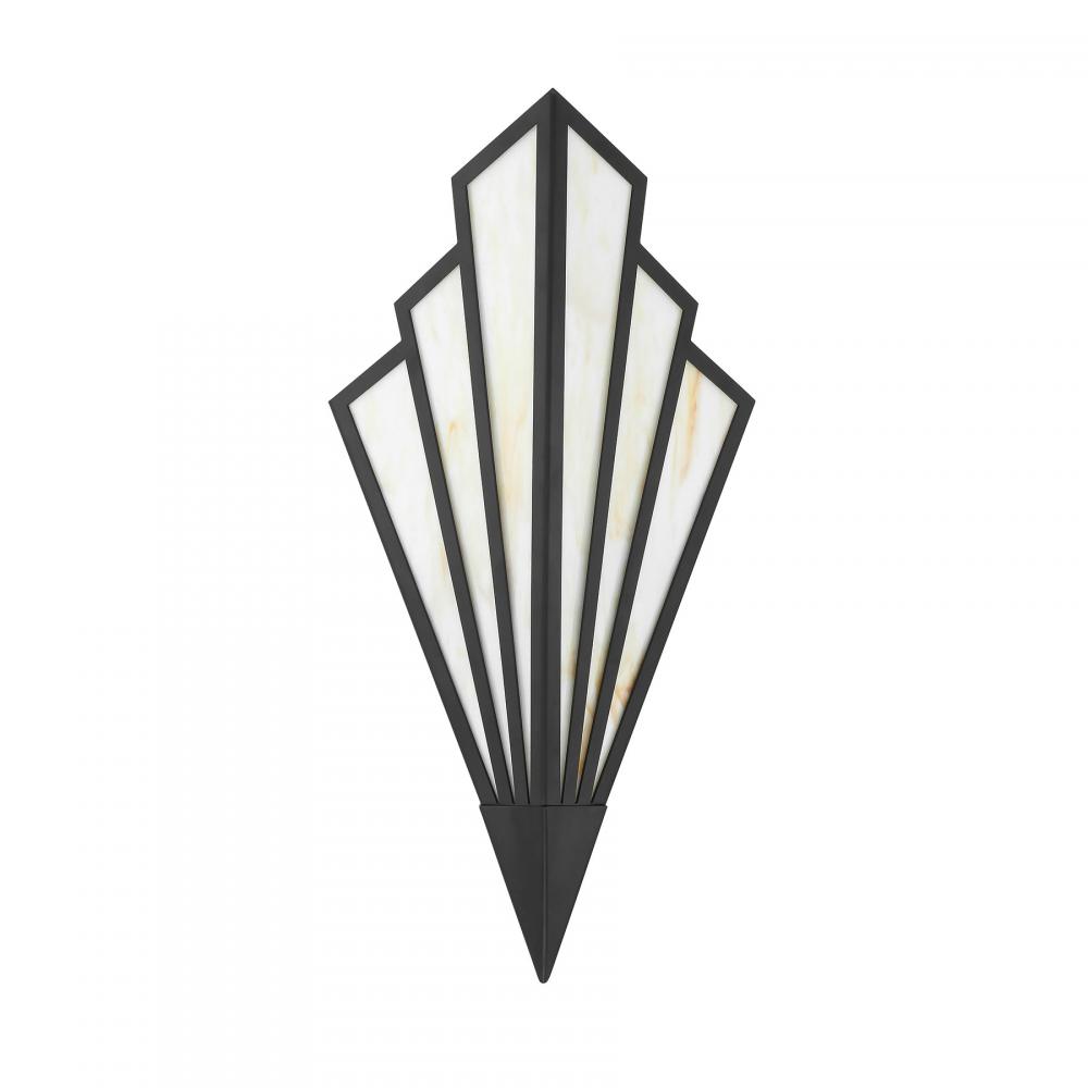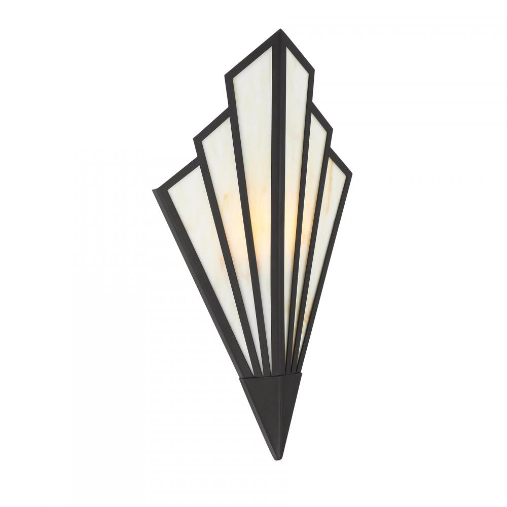 Bring a touch of Art Deco glamour to any space with the chic Savoy House Rivage 1-light sconce. Its fan-like structure is decorated with panes of beautiful Tiffany art glass and finished in Matte Black. Use it alone or in groupings for timeless allure. Rivage is 18" in height, 8.75" in width and extends 5.5" from the wall. Uses an integrated LED light source. This sconce is damp area rated.