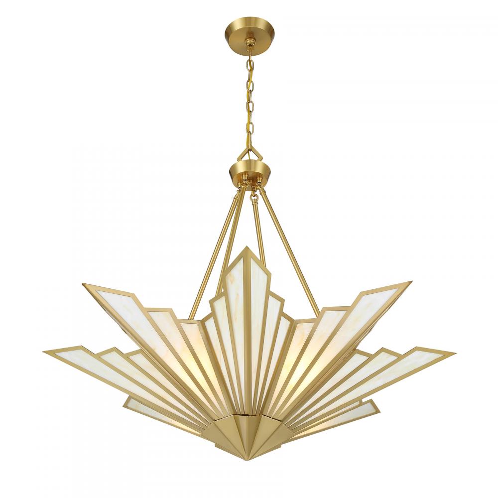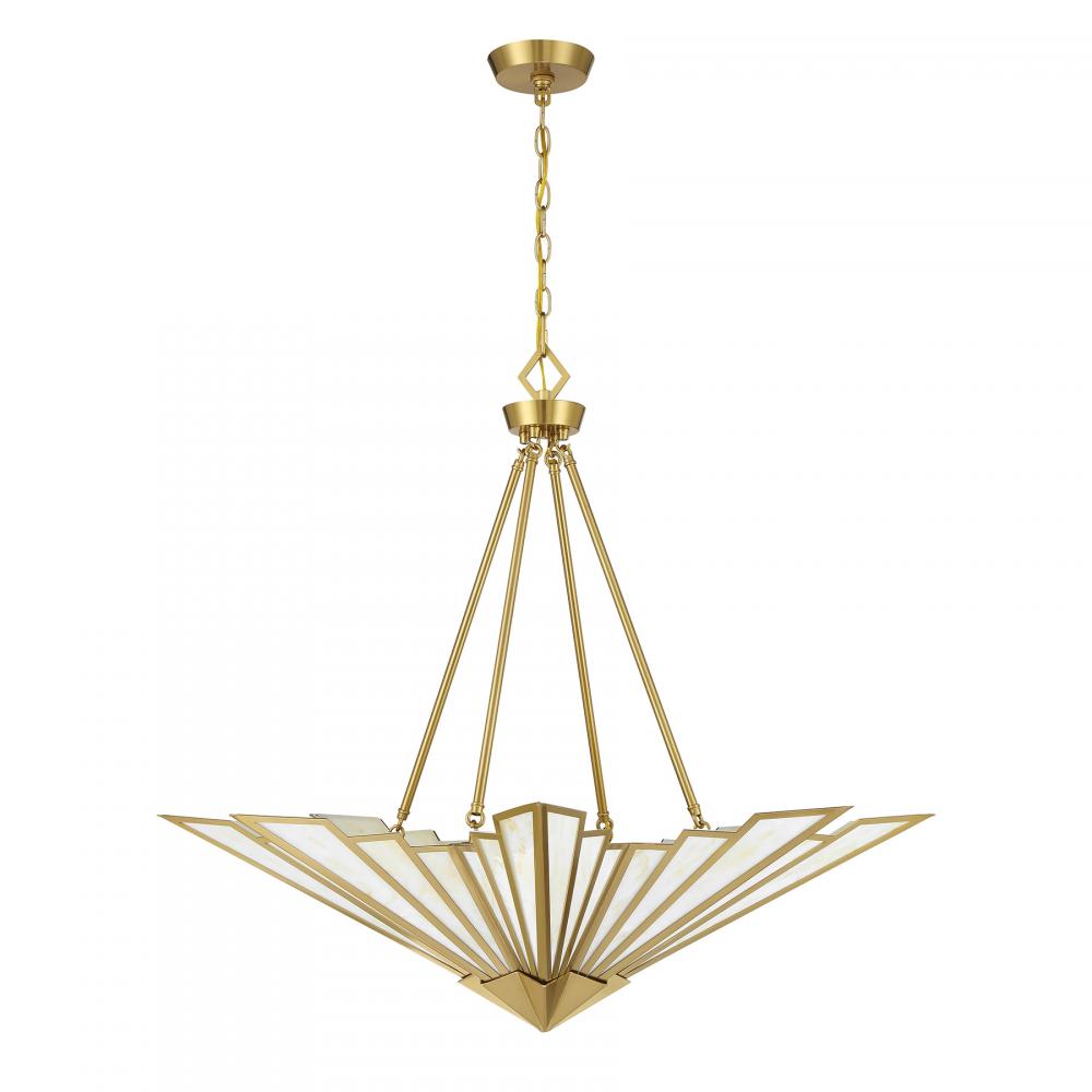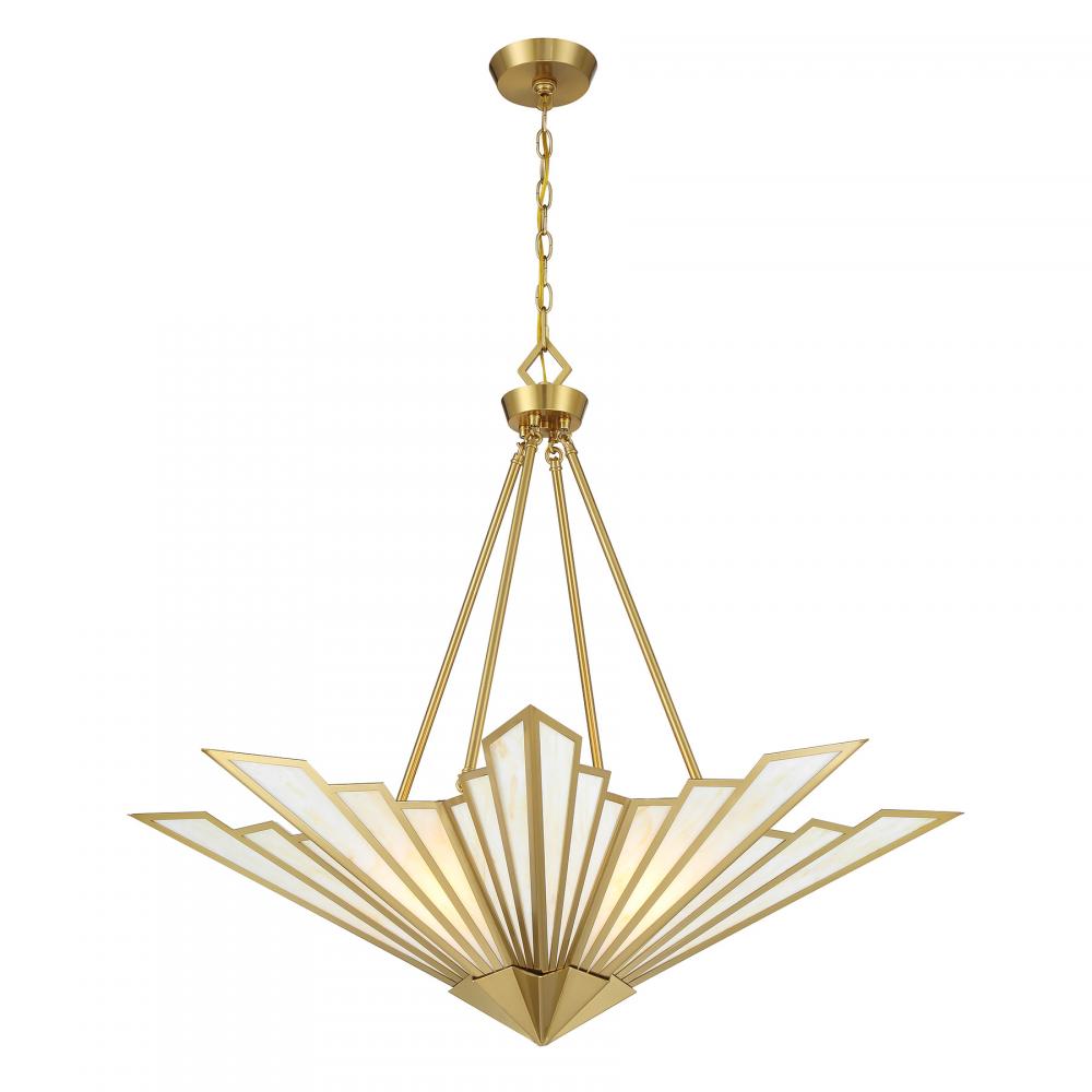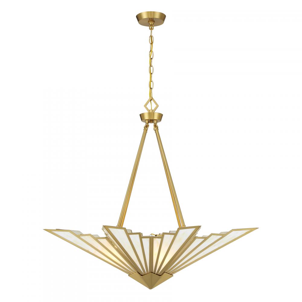 Bring a touch of Art Deco glamour to any space with the chic Savoy House Rivage 4-light pendant. Its fan-like structure is decorated with panes of beautiful Tiffany art glass and finished in Warm Brass. Use it alone or in groupings for timeless allure. Rivage is 31” in height and 36” in width. Uses four standard size bulbs of up to 60 watts per bulb. Bulbs not included. Comes with 10 feet of chain.