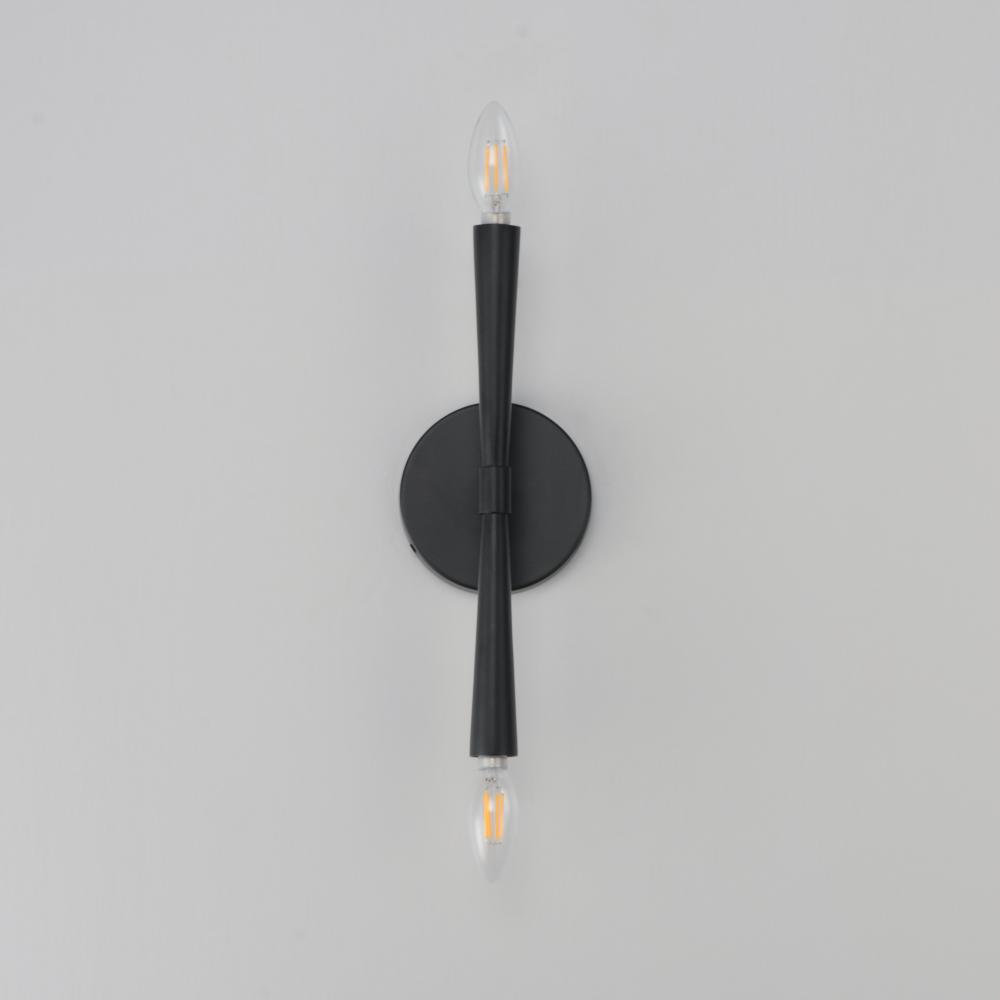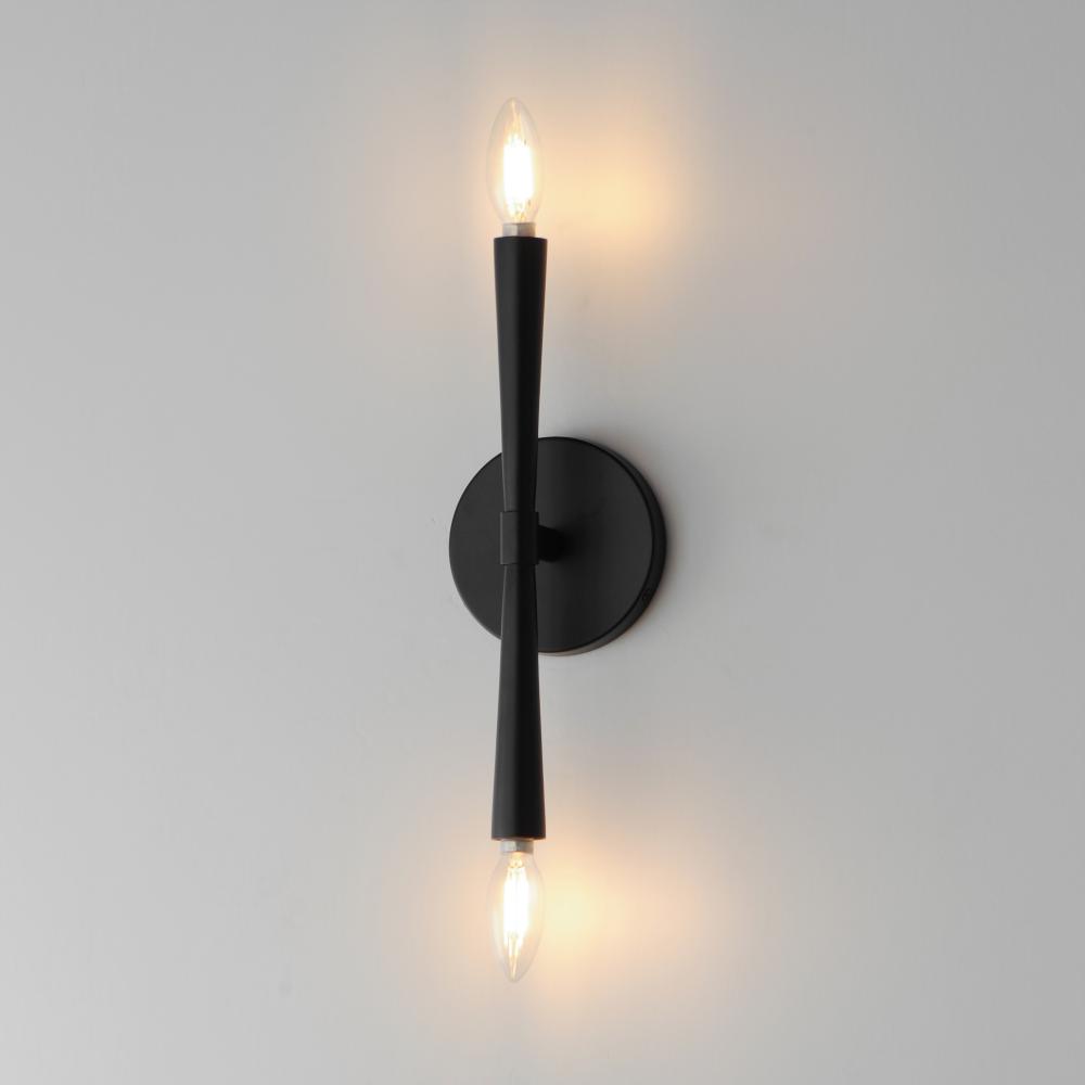 Civic styling using straight rectilinear channels radiating from a central connector. The light sources flare out both up and down with tapered candle covers creating a form evocative of a classic torch. Available in matte Black, Satin Brass, and Satin Nic