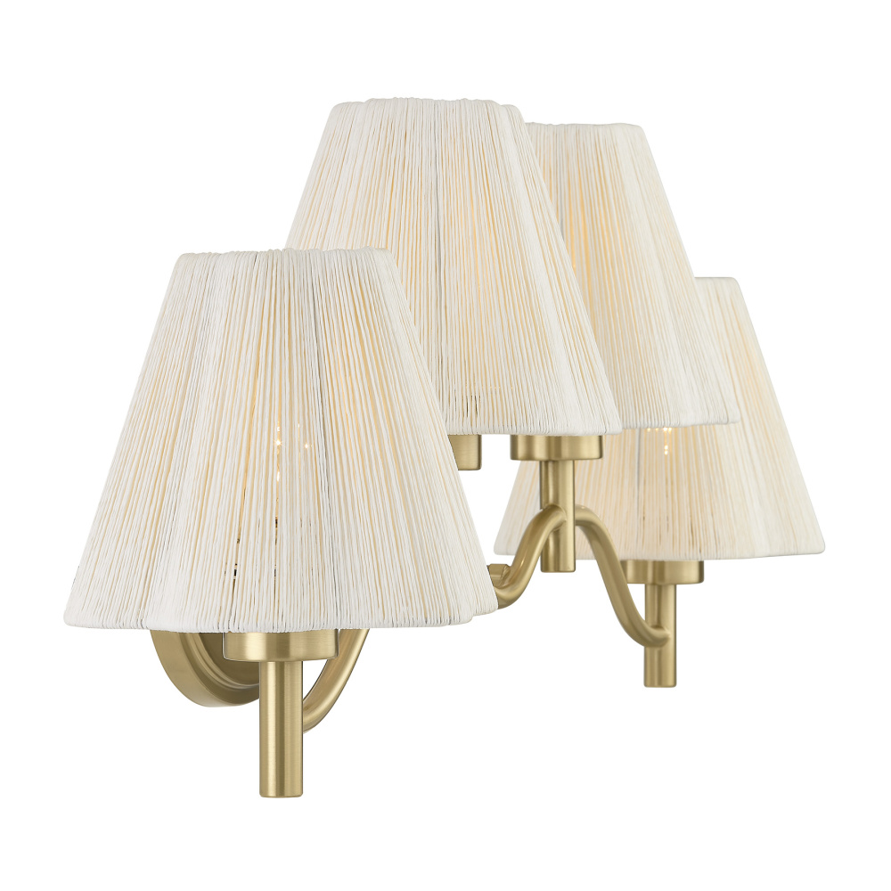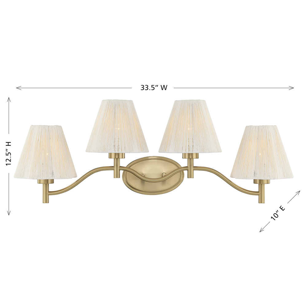 The Savoy House Rosa 4-light bath vanity light was designed by award-winning interior designer and TV host Breegan Jane. Named after the Spanish word for rose, this bath bar blooms beautifully with scalloped white string shades that add inviting natural dimension. The Noble Brass finish adds shimmer and shine. Rosa is 12.5" in height, 33.5" in width and extends 10" from the wall. It uses four standard size bulbs of up to 60 watts per bulb. Bulbs not included. This bath bar is damp area rated.