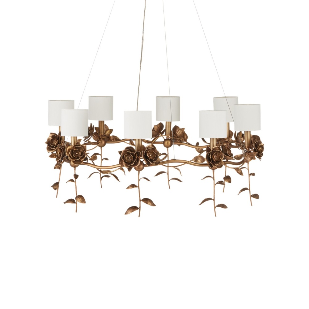 The Rosabel Chandelier is a bouquet of delight. By placing the blooms along the undulant stem and designing the leaves to float downward, it creates a whimsical gold chandelier that is nature-inspired, but seriously sophisticated. The roses and leaves are fashioned from brass in a warm antique brass finish. The white shades and the nostalgic motifs make this a terrific choice for both traditional and transitional interiors. Adjustable from 28" to 148" with use of included chain/rod kit/cable. If your space calls for a longer drop, additional chain/rods/cable is available for purchase.