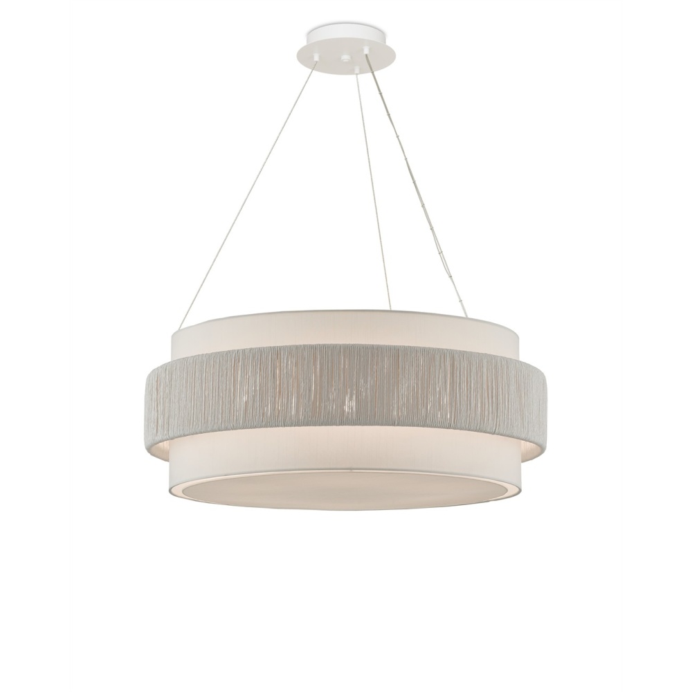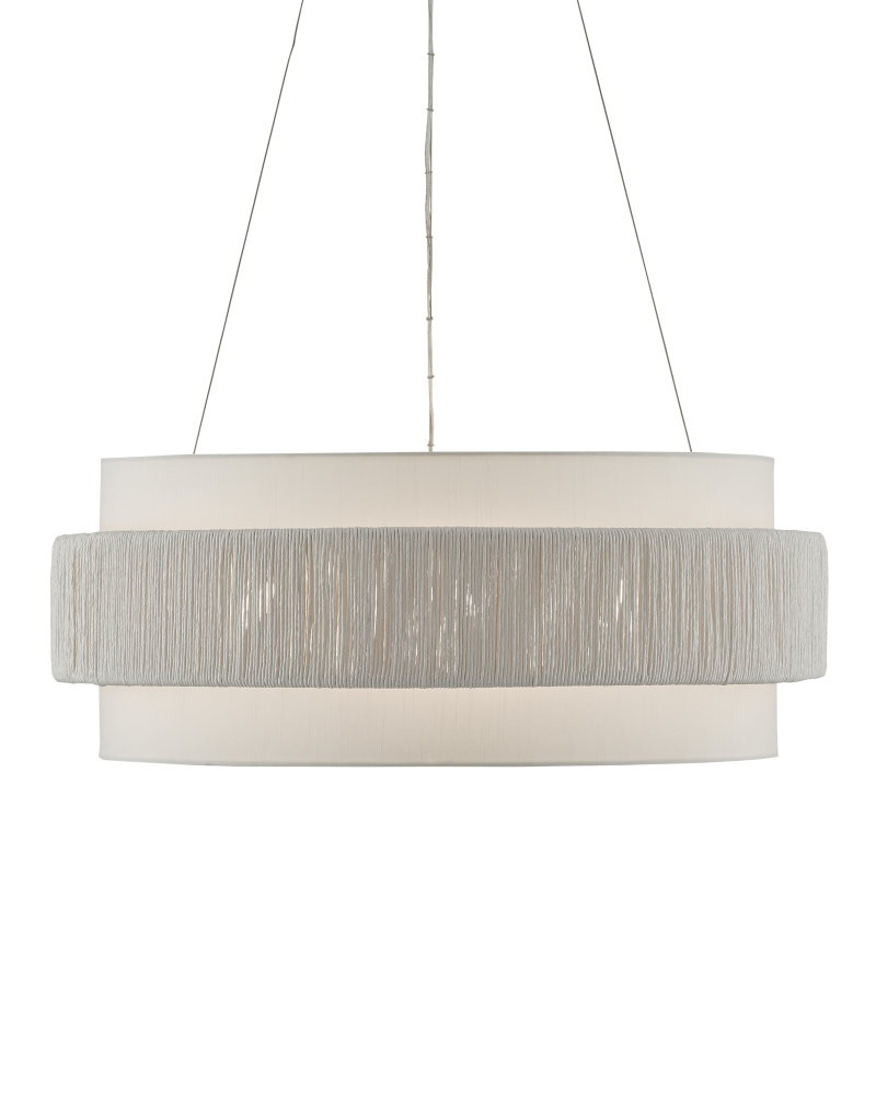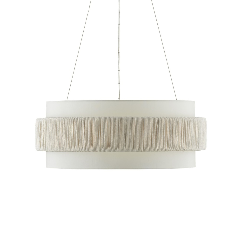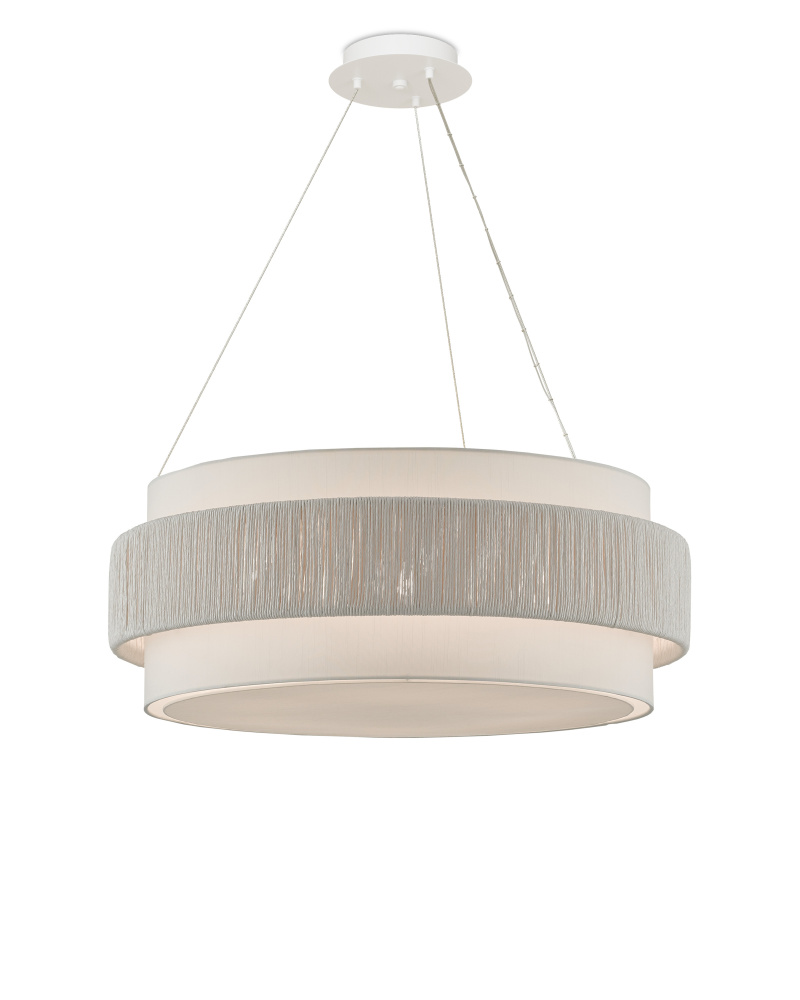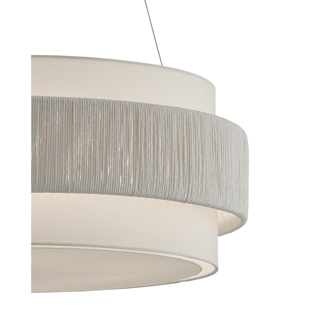 Our Rousham Chandelier has an unusual accent on its fabric shade created by the twine panel made from recycled paper that is twisted and tightly wrapped around a metal frame. The panel made from the sustainable material, which is affixed to the center of the shade, is then coated with a sealant to protect it from moisture. The beige chandelier is suspended with aircraft cable and has a sugar white finish on the interior of the shade, which brightens the light. Adjustable from 20" to 144.5" with use of included chain/rod kit/cable. If your space calls for a longer drop, additional chain/rods/cable is available for purchase.