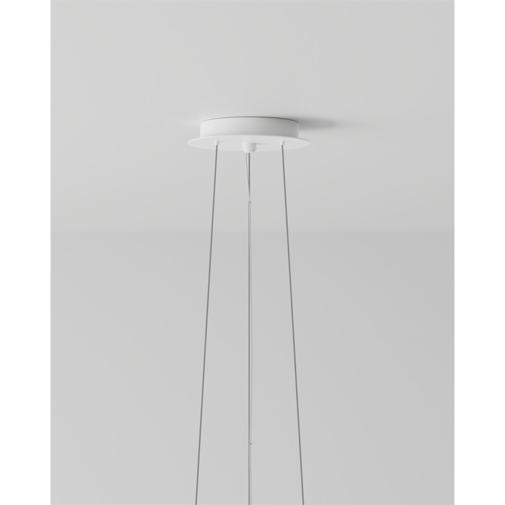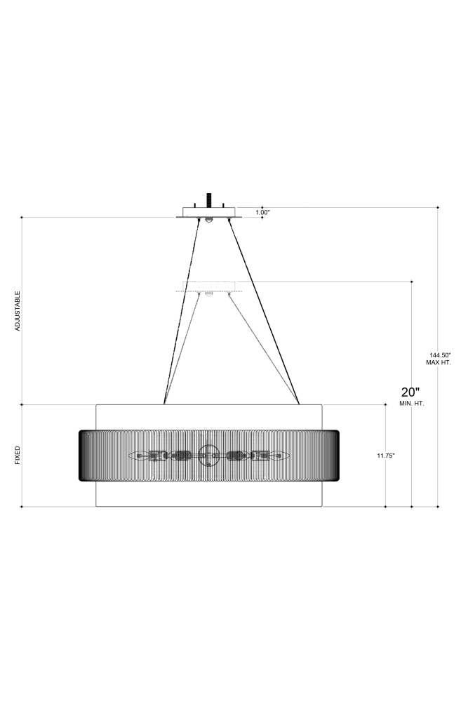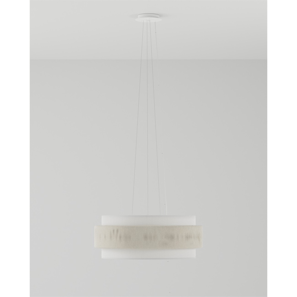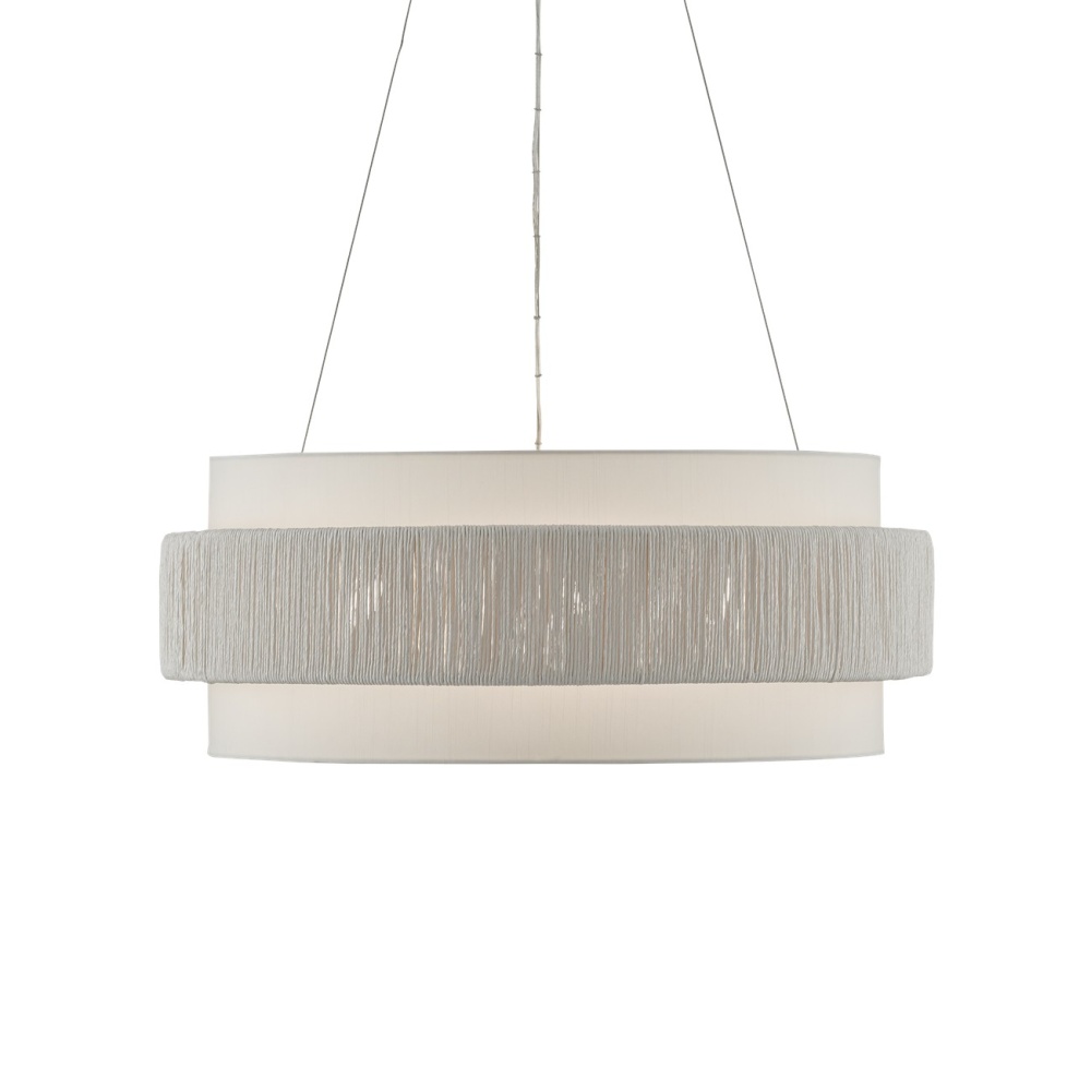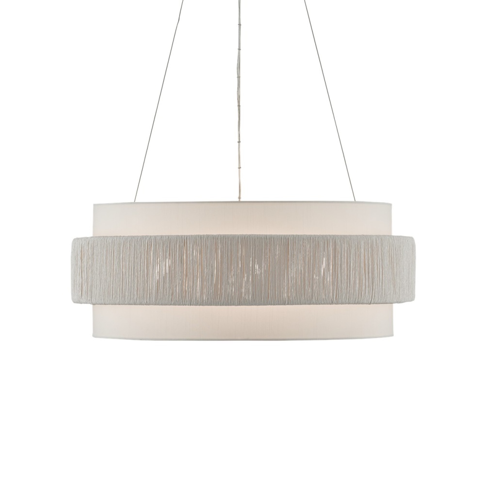 Our Rousham Chandelier has an unusual accent on its fabric shade created by the twine panel made from recycled paper that is twisted and tightly wrapped around a metal frame. The panel made from the sustainable material, which is affixed to the center of the shade, is then coated with a sealant to protect it from moisture. The beige chandelier is suspended with aircraft cable and has a sugar white finish on the interior of the shade, which brightens the light. Adjustable from 20" to 144.5" with use of included chain/rod kit/cable. If your space calls for a longer drop, additional chain/rods/cable is available for purchase.
