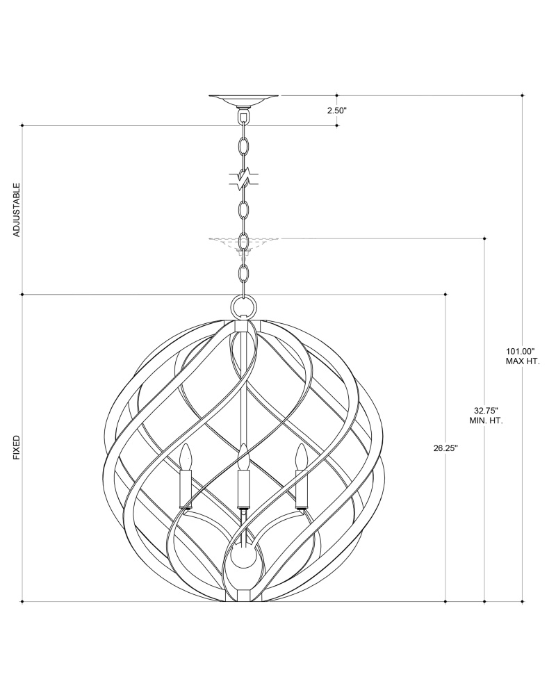 The globe shape of the Roussel Orb Chandelier is formed by bands of wrought iron in a contemporary silver leaf finish. These are turned to make them seem to undulate. The candle arms perched on thin stems seem to be floating within the swirling atmosphere of this silver chandelier. Adjustable from 32.75" to 101" with use of included chain/rod kit/cable. If your space calls for a longer drop, additional chain/rods/cable is available for purchase.