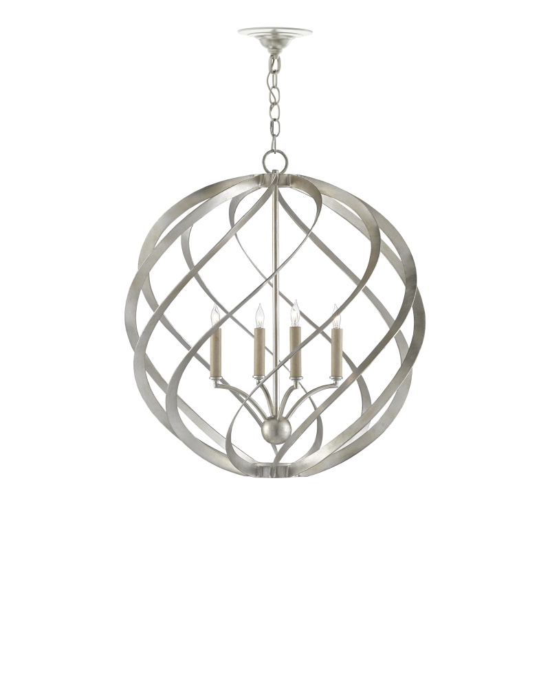 The globe shape of the Roussel Orb Chandelier would have been graceful enough had the bands of wrought iron in a contemporary silver leaf finish that surround its circumference been flat, but taking them and turning them on their sides to make the seem to undulate around the orb’s implied surface was a brilliant move by our design team. The candle arms perched on thin stems seem to be floating within a swirling atmosphere.