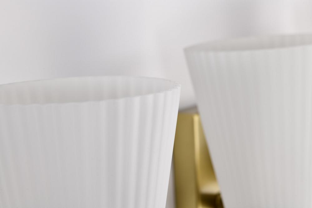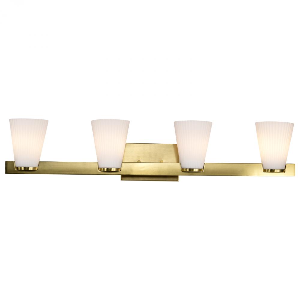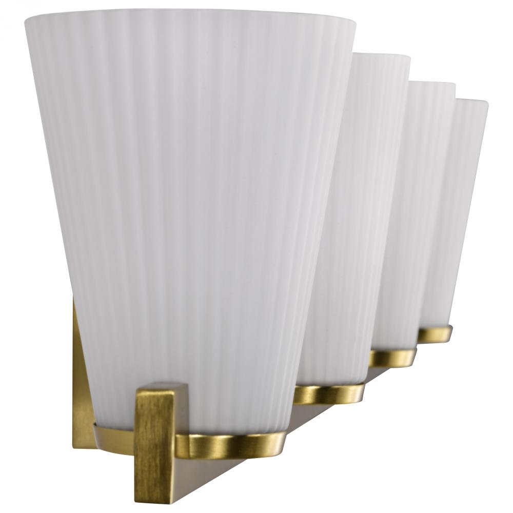 Indulge in the glamour of the Royale 60-8734 four light vanity fixture, where sleek Art Deco silhouettes meet modern refinement. The satin white pleated glass adds texture and sophistication, diffusing light with a soft, radiant glow. Finished in brushed n