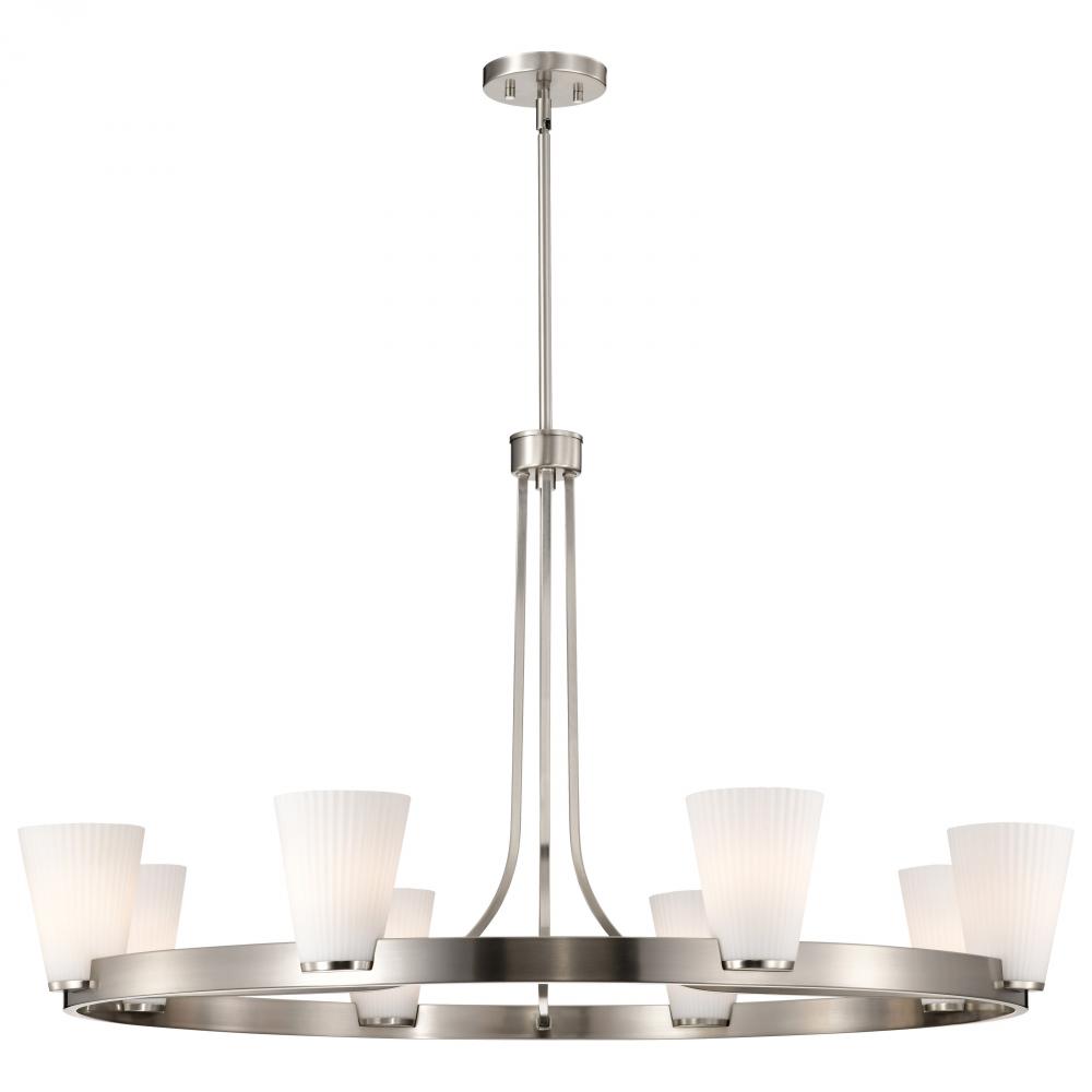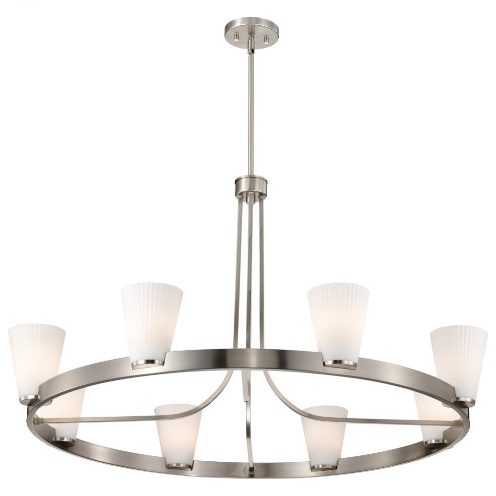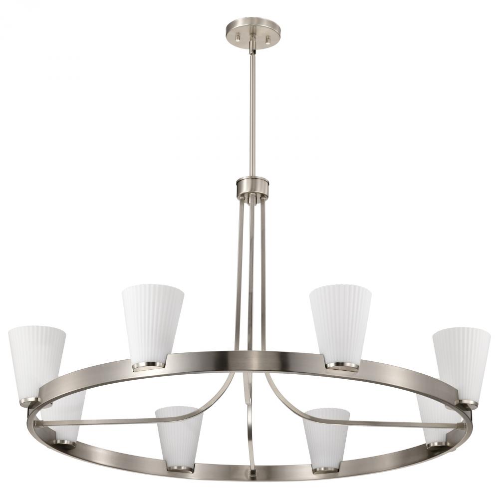 Royale; 8 Light Chandelier; Brushed Nickel Finish; Ribbed White Glass