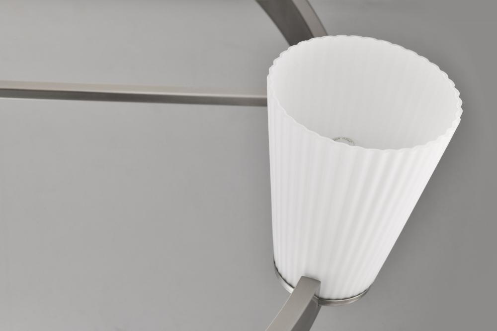 Indulge in the glamour of the Royale 60-8739 eight light chandelier, where sleek Art Deco silhouettes meet modern refinement. The satin white pleated glass adds texture and sophistication, diffusing light with a soft, radiant glow. Finished in brushed nick