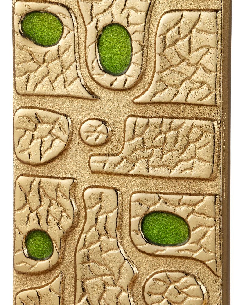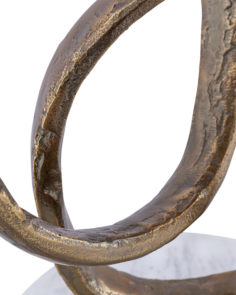 The masculine design of the Ruben Accent Table has a number of special attributes that include the rough luxe feel of the curling metal ribbon, and the contrasting white marble base and top. The ribbon, which is made of cast aluminum in an antique brass finish, rises from the stone base to hold the thin white top in place. The natural veining in the stone will make each piece unique.