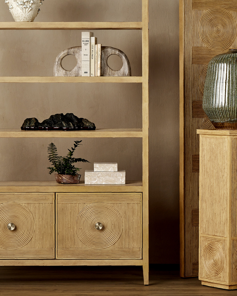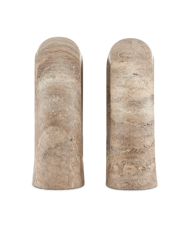 The Russo Travertine Object Set is made of titanium travertine; the surfaces of the sculptural pieces swirling with a more dynamic pattern than some travertine stones do. These brown sculptures were designed so they can also stand in for bookends. The pitting and veining on these objects will vary from piece to piece, given they are made of natural stone.