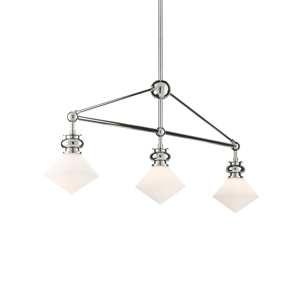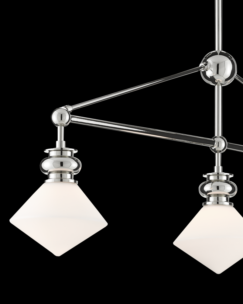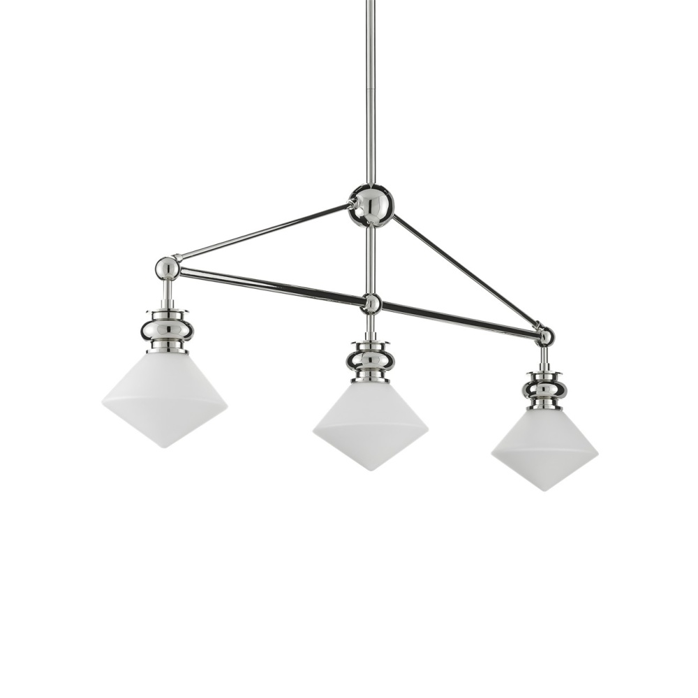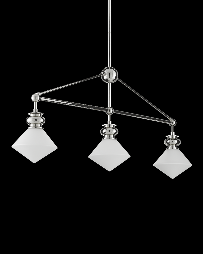 The Rycroft Rectangular Chandelier is a smart choice when a tailored design element is desired. The pointy rhombus-like shades, made of opaque glass, were inspired by a spinning top. This silver chandelier features a polished nickel finish on the metal. Adjustable from 24.5" to 60.5" with use of included chain/rod kit/cable. If your space calls for a longer drop, additional chain/rods/cable is available for purchase.