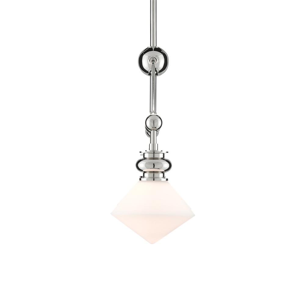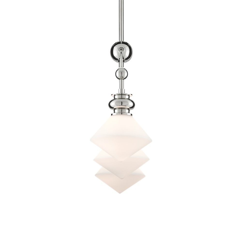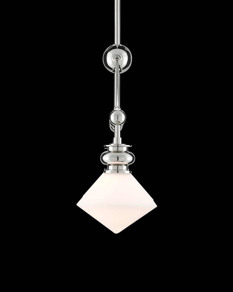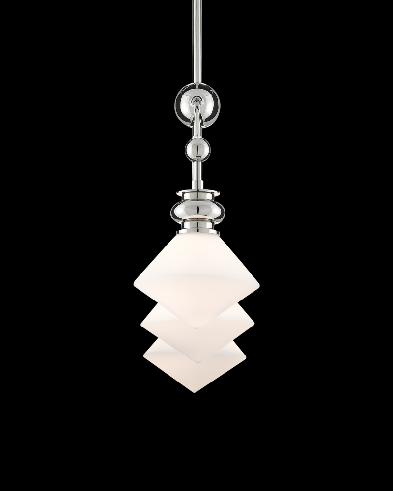 The Rycroft Rectangular Chandelier is a smart choice when a tailored design element is desired. The pointy rhombus-like shades, made of opaque glass, were inspired by a spinning top. This silver chandelier features a polished nickel finish on the metal. Adjustable from 24.5" to 60.5" with use of included chain/rod kit/cable. If your space calls for a longer drop, additional chain/rods/cable is available for purchase.
