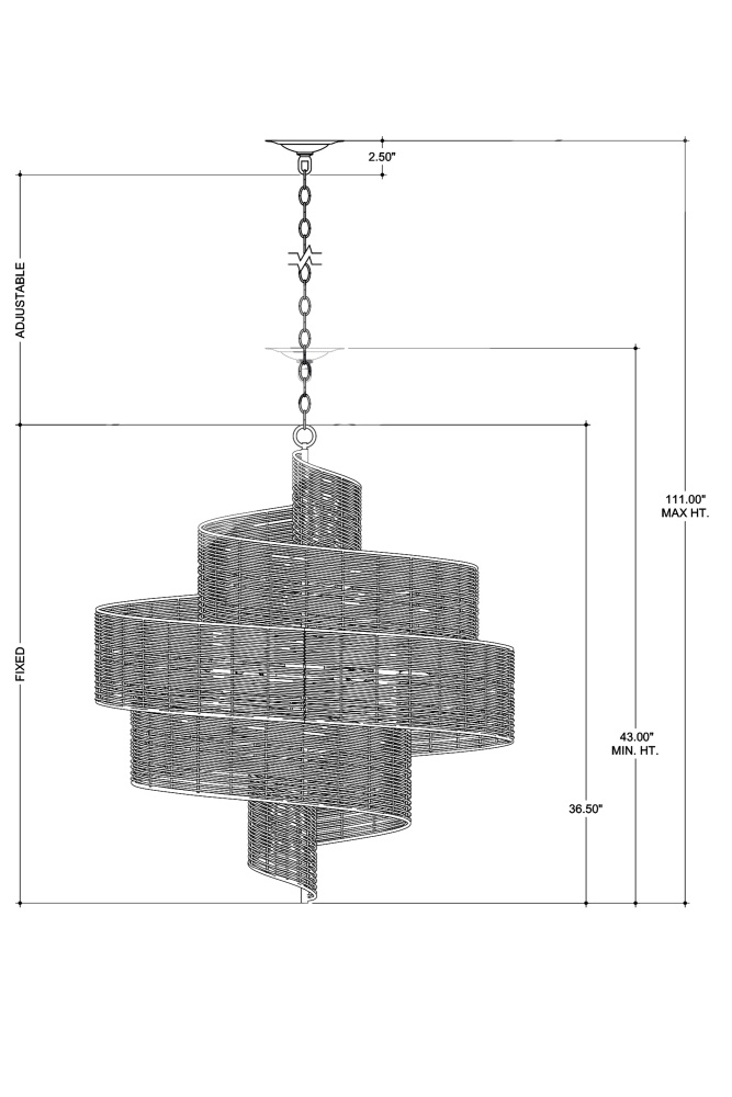Hiroshi Koshitaka envisioned the Saisei Medium Chandelier as one of a number of fixtures he sees as fulfilling the concept that encompasses the acts involved in regeneration and reproduction as we restore, revive, and experience regrowth and rebirth. Rattan flows artfully around a spiral wrought iron frame in a khaki finish, which is tonally in sync with the natural color of the material. The otherworldly shape of this rattan chandelier was inspired by outer space — galaxies in the universe come to light. Adjustable from 43" to 111" with use of included chain/rod kit/cable. If your space calls for a longer drop, additional chain/rods/cable is available for purchase.