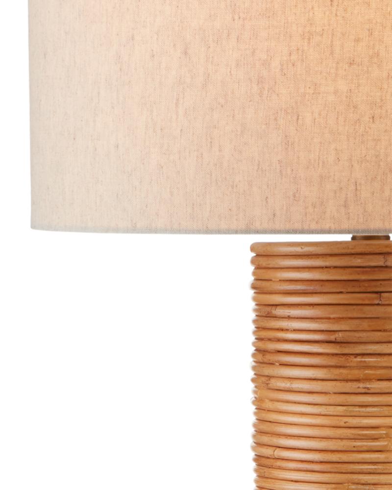 A simple column becomes a nautical design element when it is wrapped in strips of rattan. This is the case with the Salome Table Lamp, which calls to mind seaside rooms open to the ocean's breezes. The hardware that fastens the shade to the rattan lamp wears brass finish, and the finial is also wrapped in rattan--the shape a smaller-scaled version of the columnar body. A design detail of note is how the texture of the shade echoes the ruddiness of the rope.