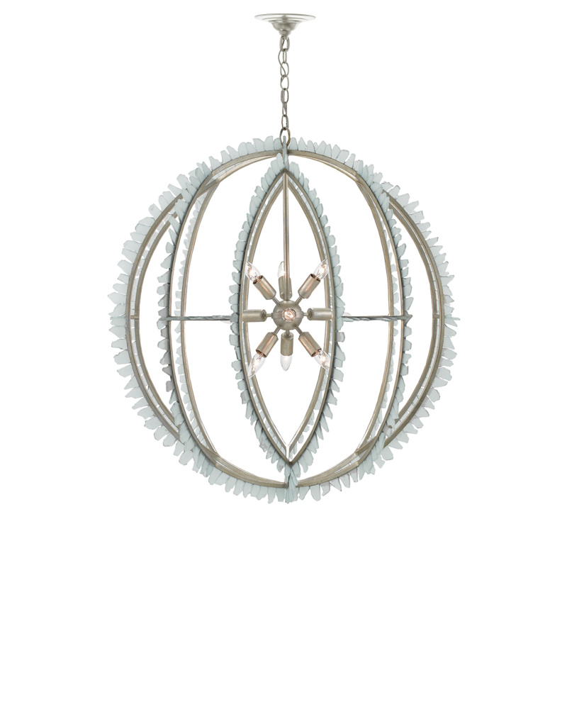 The Saltwater Orb Chandelier will enchant a space with its beauty, the frosted recycled glass pieces ornamenting its wrought iron frame providing added buoyancy when the light source is switched on. Produced to mimic the beauty of sea-glass, the slight aqua tinge of the glass works in concert with the contemporary silver leaf finish on the frame to accentuate the oceanic loveliness of this nine-light work of art.