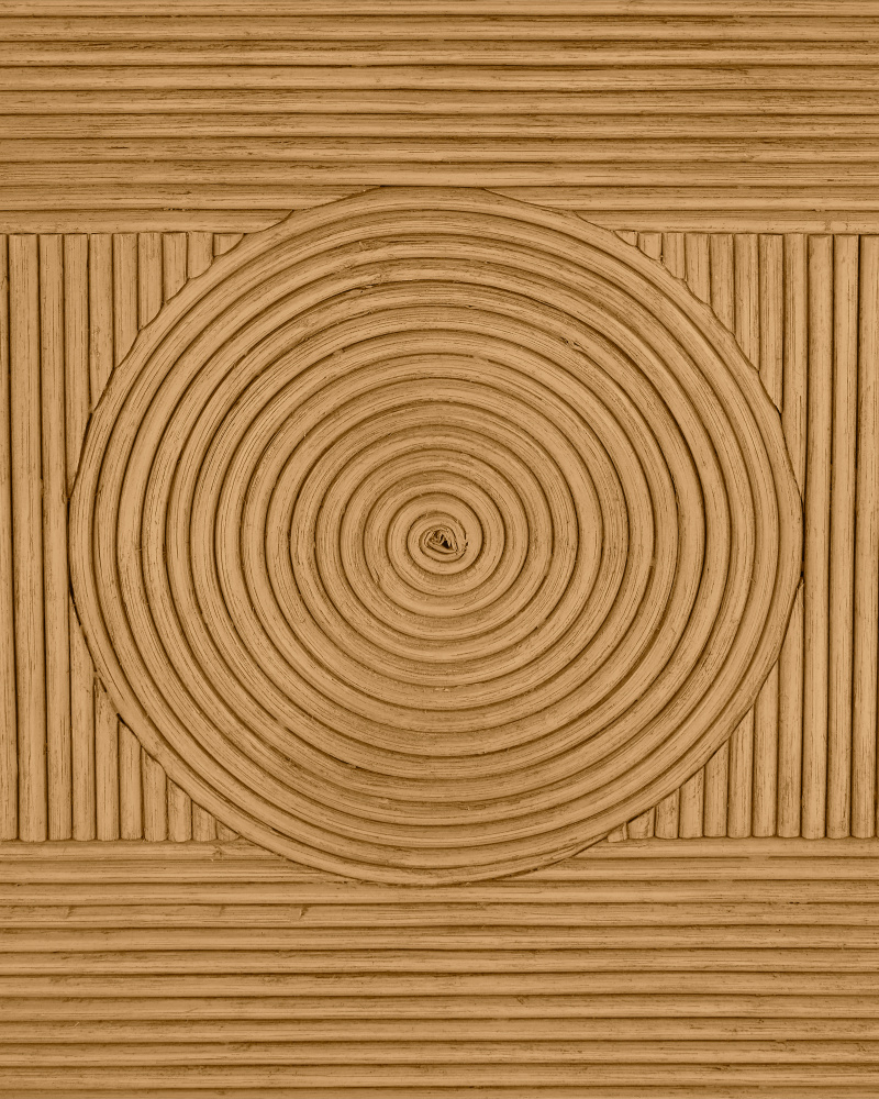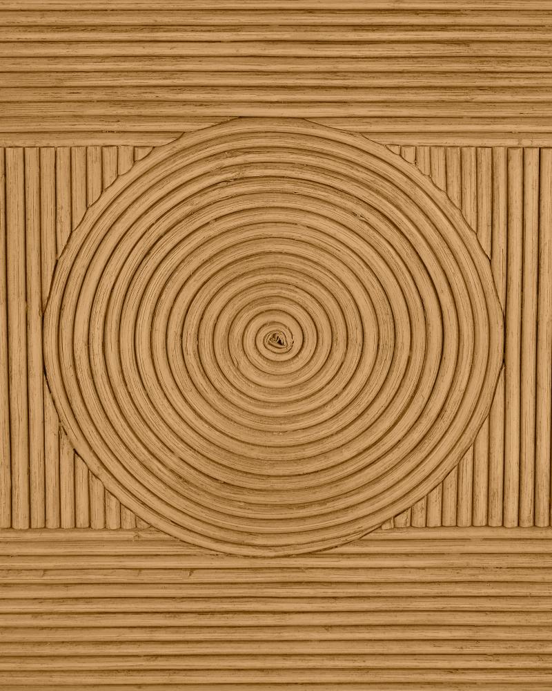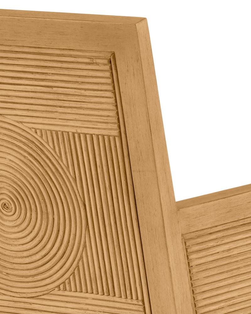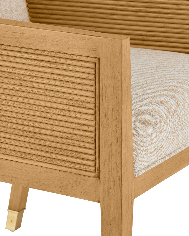 The Santos Sea Sand Armchair has a split rattan pattern on the back, and on the inside and outside of the arms, which is made by hand and applied to a solid mahogany frame. Once the natural material is in place, a sea sand finish covers the back, frame, and legs. The tan armchair is upholstered in a Liller Malt material. The chair has brass ferrules to add sophistication to the overall design.