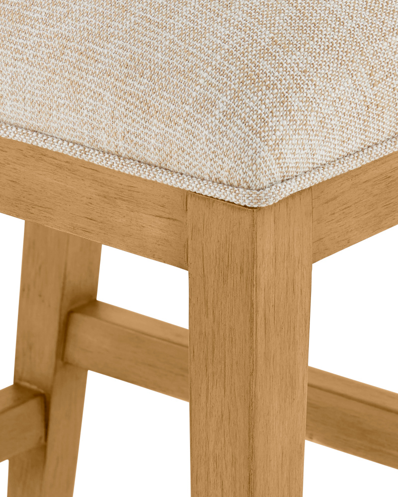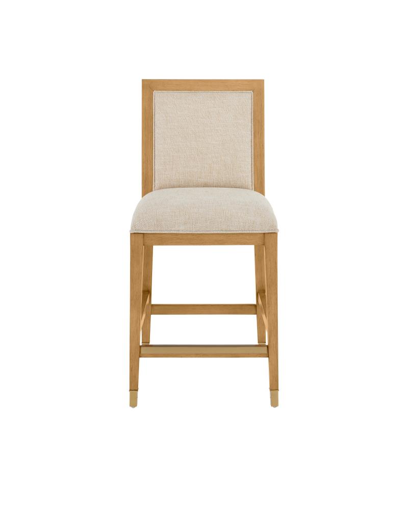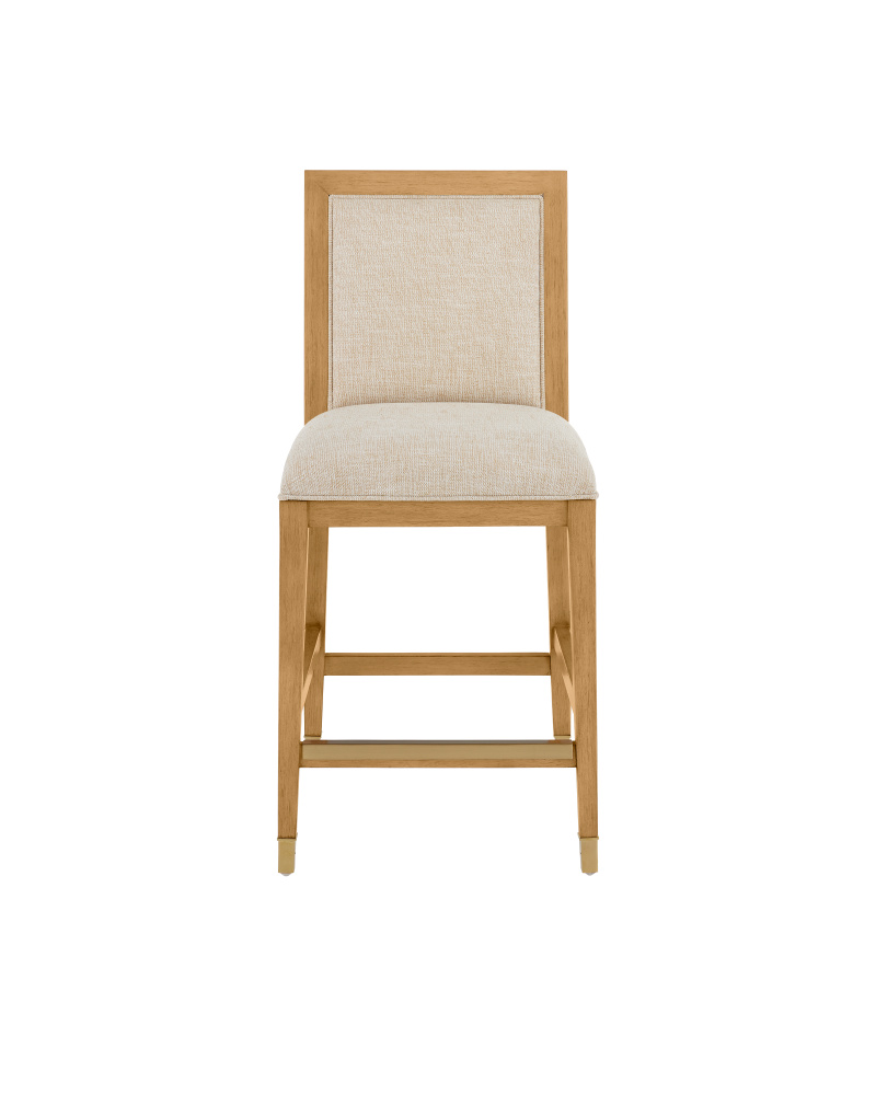 The Santos Sea Sand Counter Stool has a split rattan pattern on the back, which is made by hand and applied to a solid mahogany frame. Once the natural material is in place, a sea sand finish covers the back, frame, and legs. The tan counter stool is upholstered in a Liller Malt material. The stool has brass ferrules with a capped step to add sophistication to the overall design.