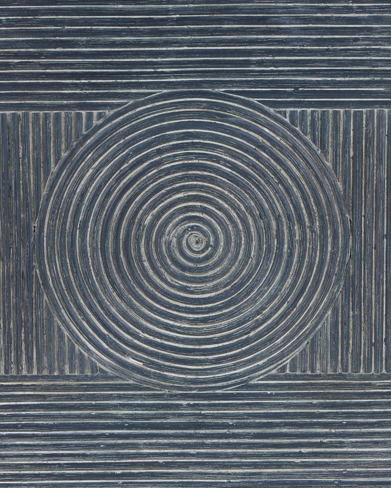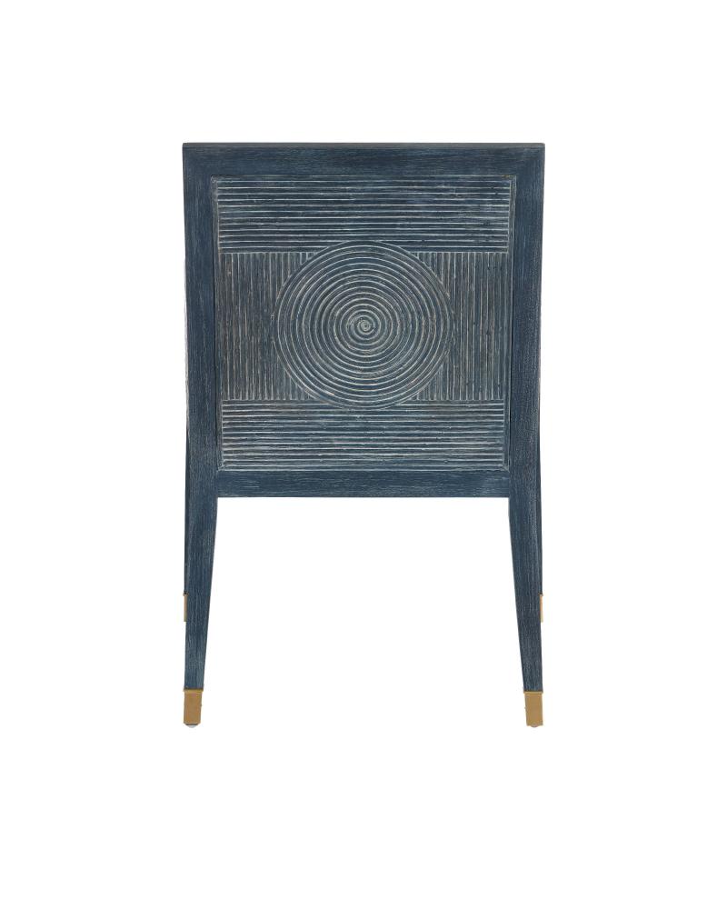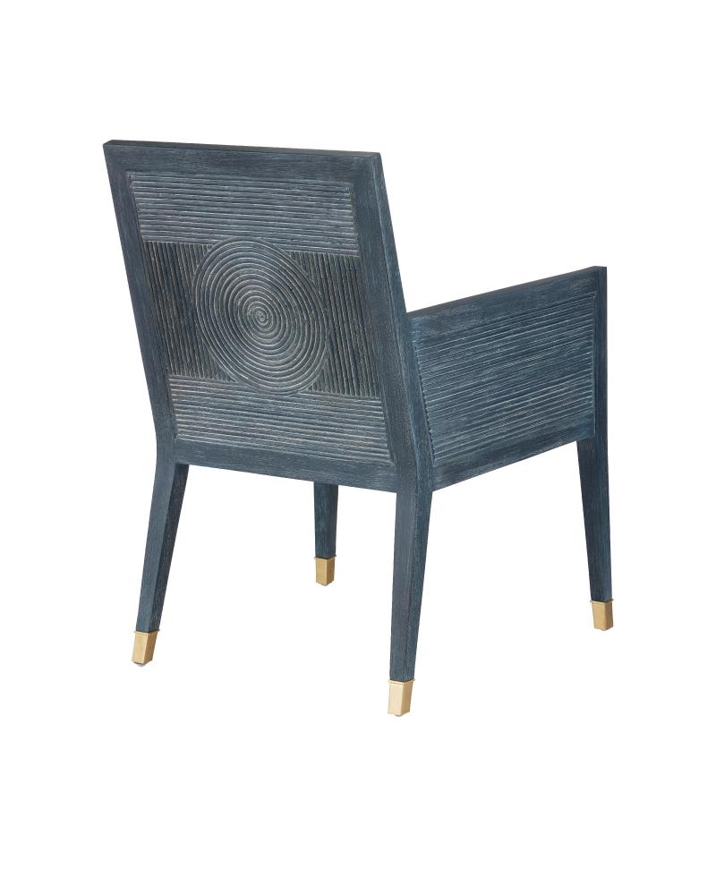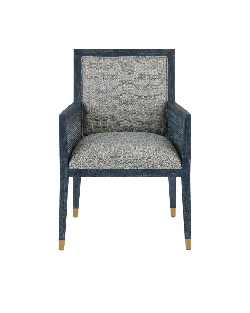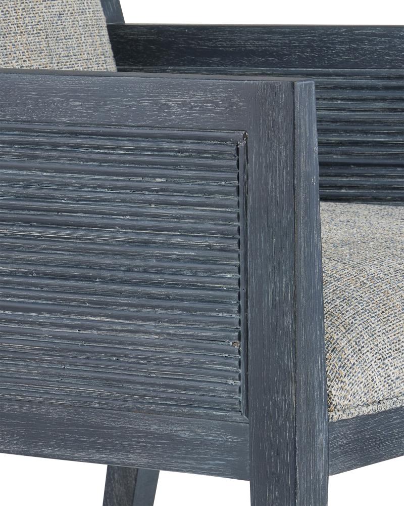The Santos Vintage Navy Armchair has a split rattan pattern on the back, and on the inside and outside of the arms, which is made by hand and applied to a solid mahogany frame. Once the natural material is in place, a vintage navy finish covers the back, frame, and legs. The blue armchair is upholstered in a Barrett Dusk material. The chair has brass ferrules to add sophistication to the overall design.