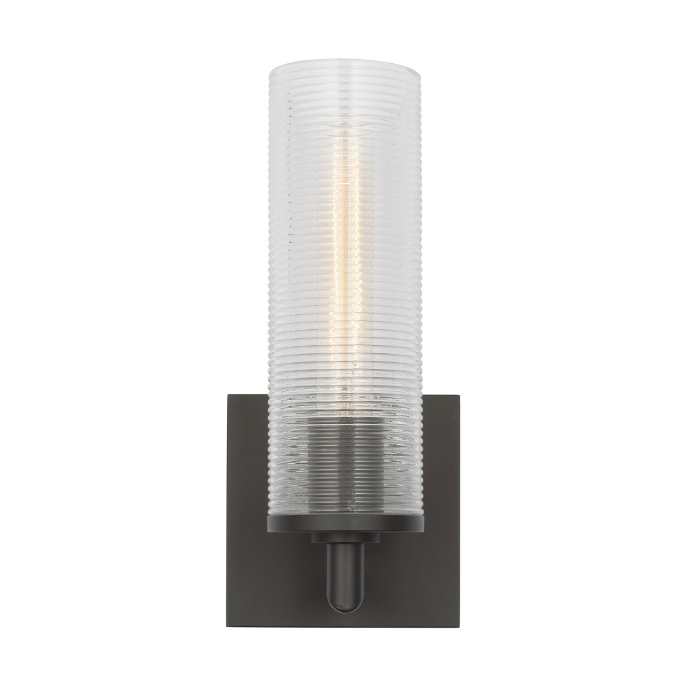 Modern aesthetic meets textural detail in the Sarita sconce by Drew & Jonathan. Ribbed glass completes the streamlined cylindrical forms while diffusing light and elegantly contrasting the bold square backplate. This sophisticated sconce will lend a subtle industrial accent and is ideal for bathrooms.