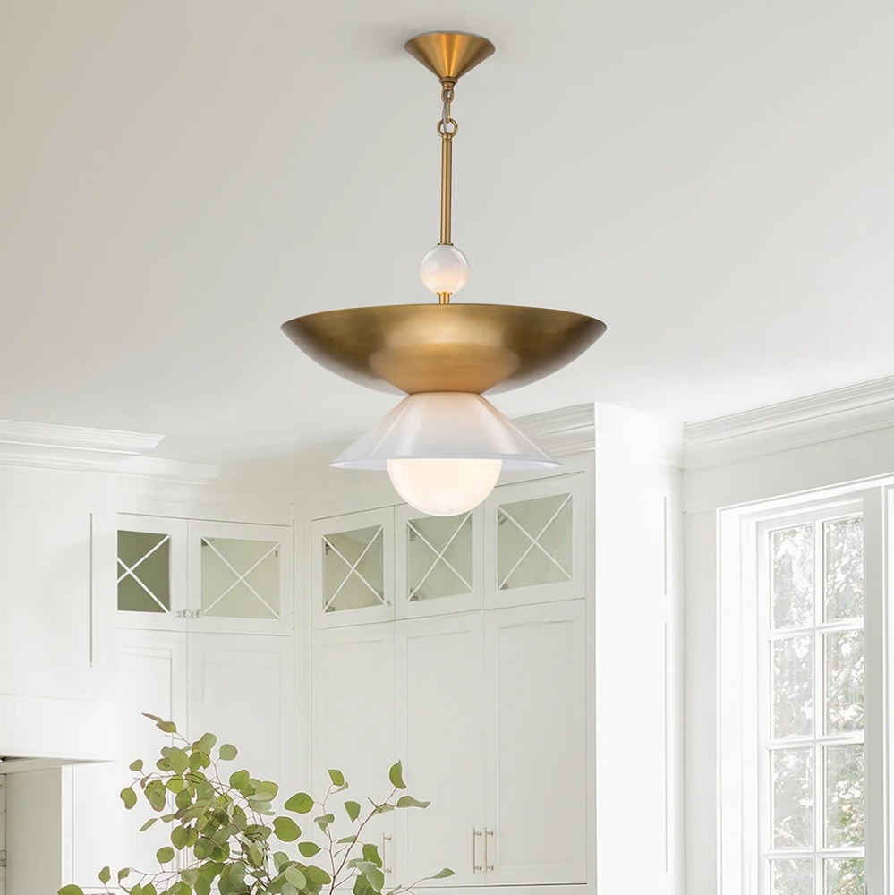 Saucer 20" Pendant: adjustable multi-tier design in Aged Brass. Hidden lights create an uplight effect, while an Opal Glass orb below casts clean, functional light downward.