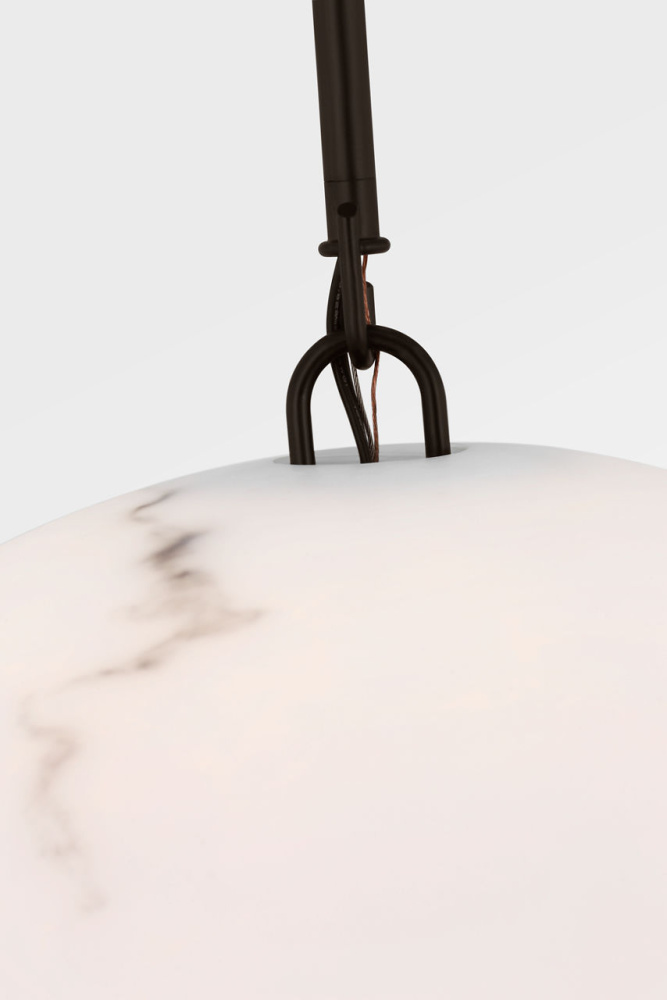 The Savina 20" Pendant by Chapman & Myers showcases the collection’s sculptural elegance and material innovation. Crafted from mineral opaline—a new addition to the brand’s palette—its hand-formed domed shade evokes the natural beauty of alabaster, With unique veining that ensures no two pieces are alike. Mounted to a minimal metal frame, the 20" pendant offers a clean silhouette and soft, diffused glow. With its generous scale, it’s ideal for dining rooms, kitchen islands, foyers, and living rooms—spaces where its organic texture and refined simplicity bring warmth and quiet sophistication.