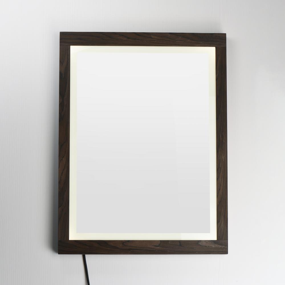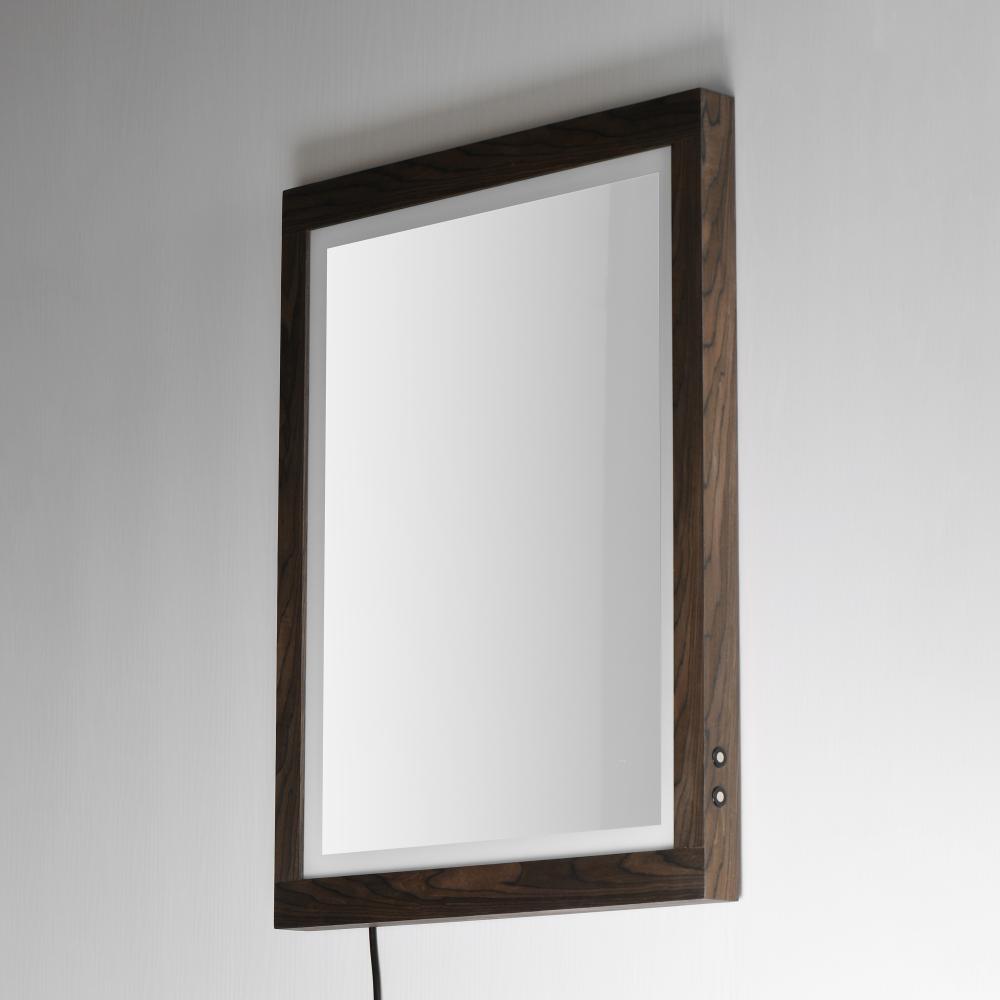 A wood-framed mirror is offered in a choice of Walnut or Distressed Oak, combining natural elements with modern functionality. A 2-inch frosted band along the frame's interior is backlit with LEDs, providing optimal illumination above a vanity. A discr