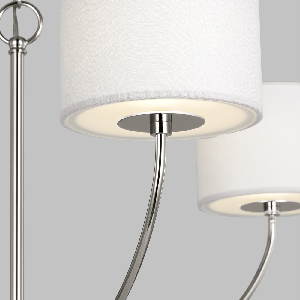 Inspired by kate spade whimsical geometry and playful lines, Sawyer has a striking silhouette with graphically taped shades. The Sawyer small chandelier by kate spade New York in polished nickel is a wide playful chandelier with arched lines and wide, graphically taped shades. This simple and graphic chandelier would be great over a dining table or nook, as well as in a living room scenario.