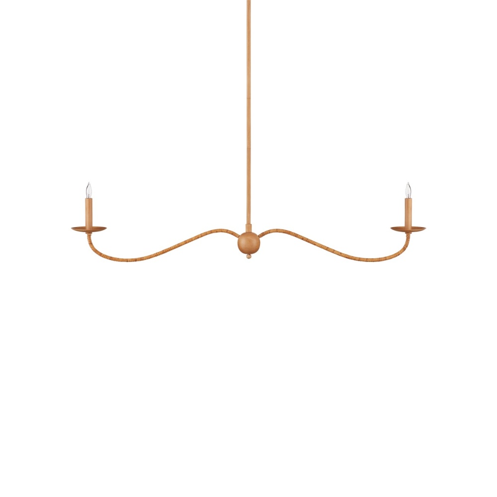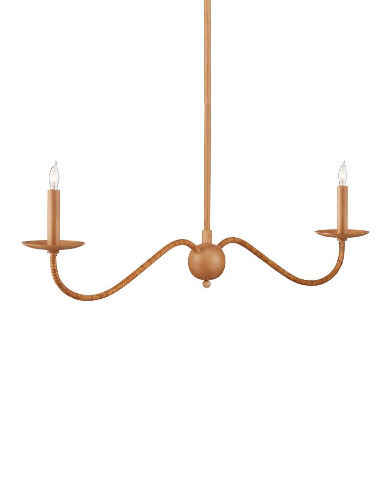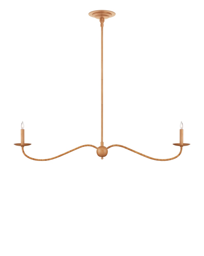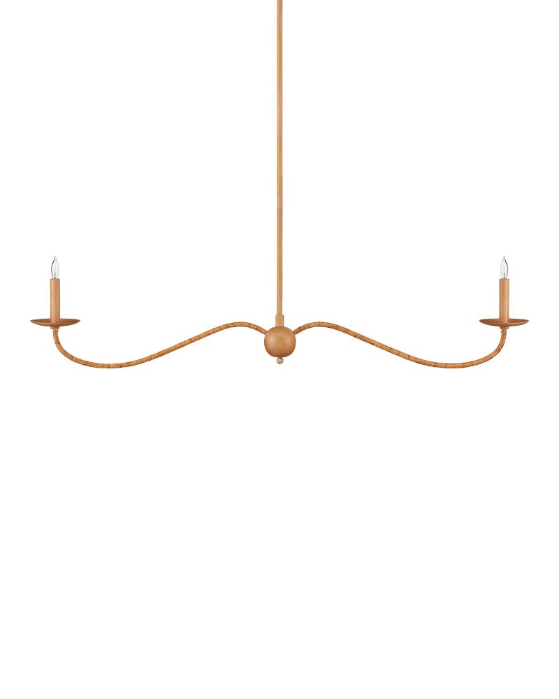 The Saxon Linear Tan Chandelier has a shape that is a nod to a bygone era, but its slender lines that arc gracefully and the natural rattan wrapped around it make its profile feel modern. Its reach makes it perfect for above kitchen islands and bars. The stylistic notes it exudes include traditional, transitional, and coastal chic. This is an artisanal piece, as the rattan is painstakingly wrapped by hand. Adjustable from 17" to 58.5" with use of included chain/rod kit/cable. If your space calls for a longer drop, additional chain/rods/cable is available for purchase.