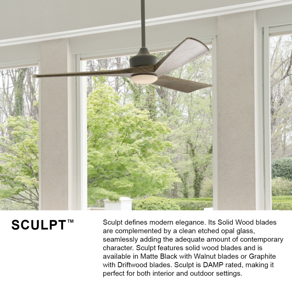 Sculpt defines modern elegance. Its Solid Wood blades are complemented by a clean etched opal glass, seamlessly adding the adequate amount of contemporary character. Sculpt features solid wood blades and is available in Matte Black with Walnut blades or Graphite with Driftwood blades. Sculpt is DAMP rated, making it perfect for both interior and outdoor settings.